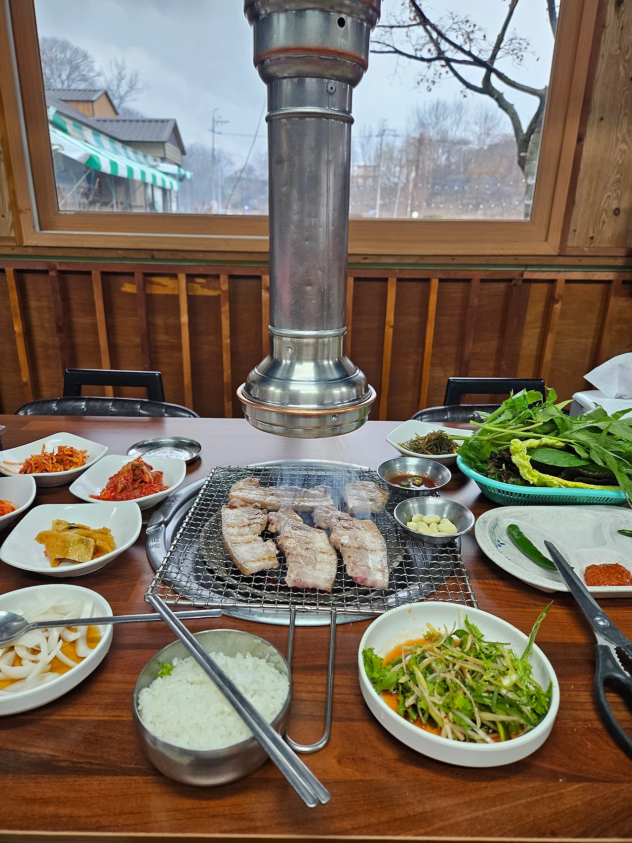 땀을 뺐으니 배를 채울 시간! 참숯가마에서 나온 숯으로 삼겹살을 초벌 해서 주는데 이게 또 엄청난 별미다. 껍데기는 바삭하고 비계는 쫀득하게 구워진 삼겹살을 쌈에 싸서 입 한가득 넣으면 이게 행복이지 싶다.