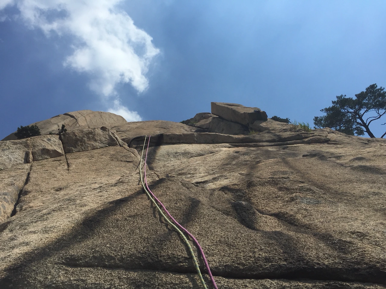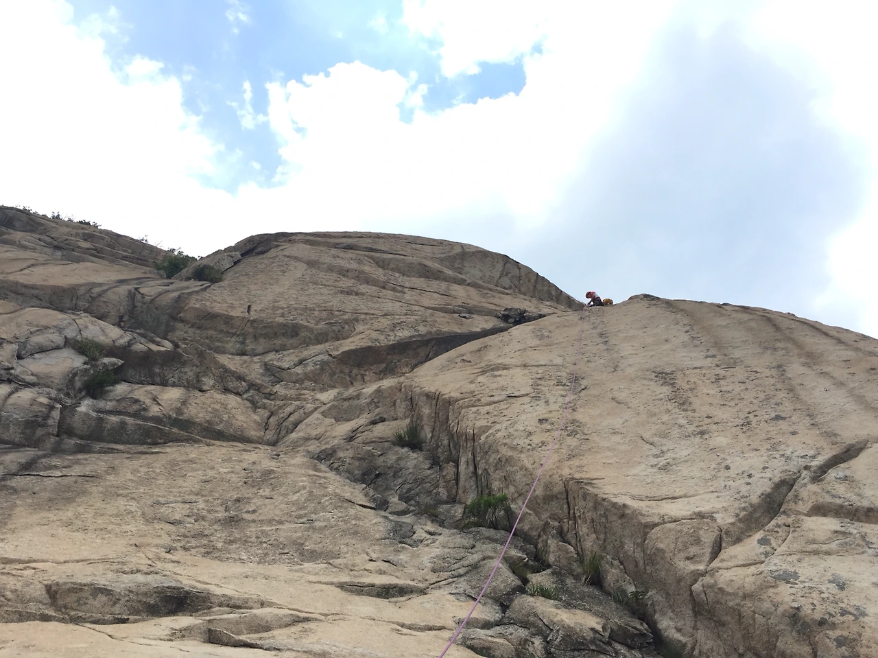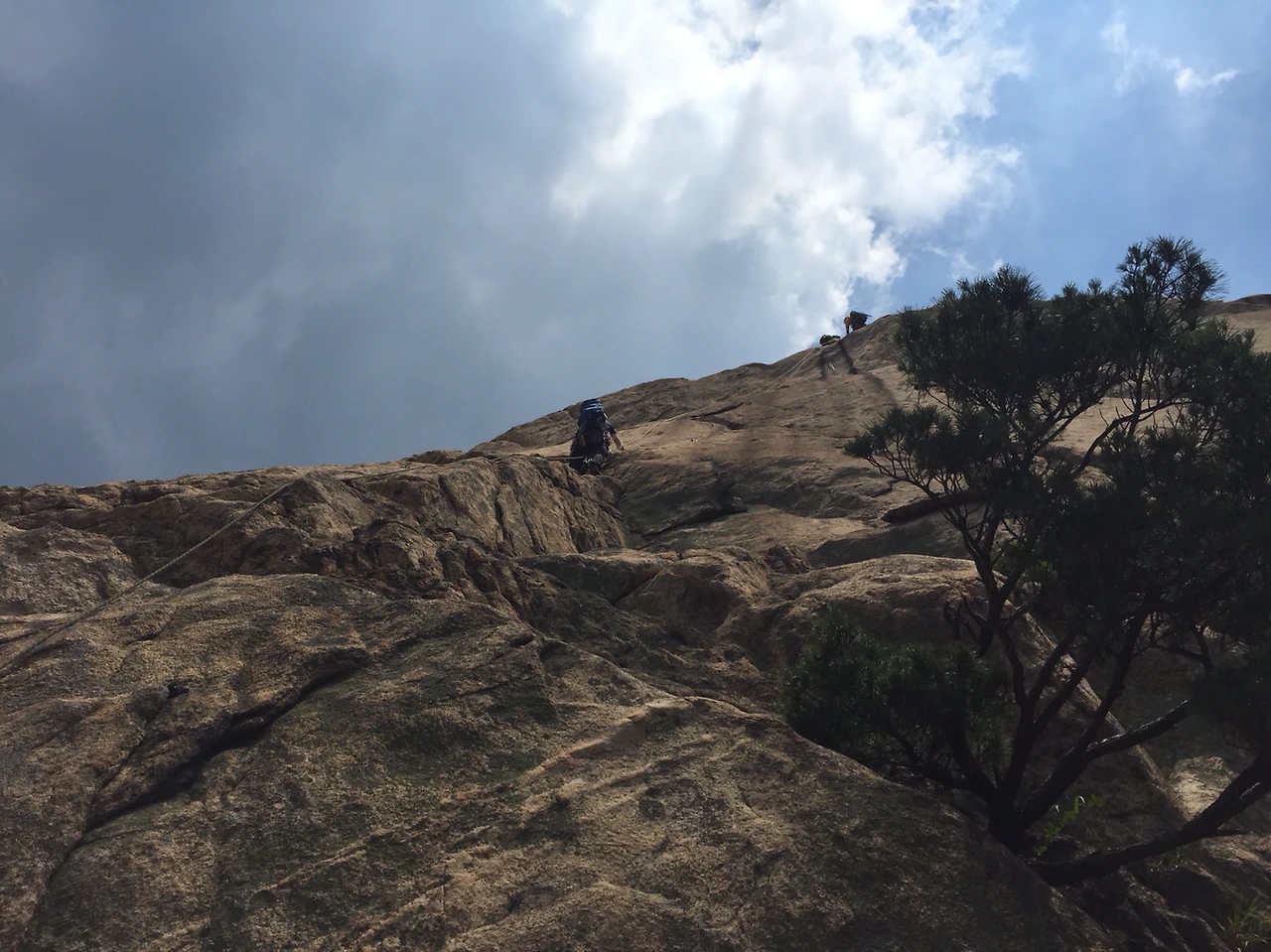 버벅거리다 선배들의 조언으로 겨우 오른다. 고도감은 아직 시작도 안 했는데 옆으로 게걸음 치려니 발걸음이 쉬이 떨어지질 않는다. 울렁증이 벌써 시작되는구나. 한번도 뒤돌아보지 않고 오른다.