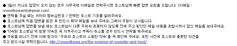 메일에 적힌 안내사항처럼 3일이 지나도 호스트에게 답장이 오지 않는 경우 사무국 이메일로 연락해 볼 것 : wwoofkoreainfo@gmail.com