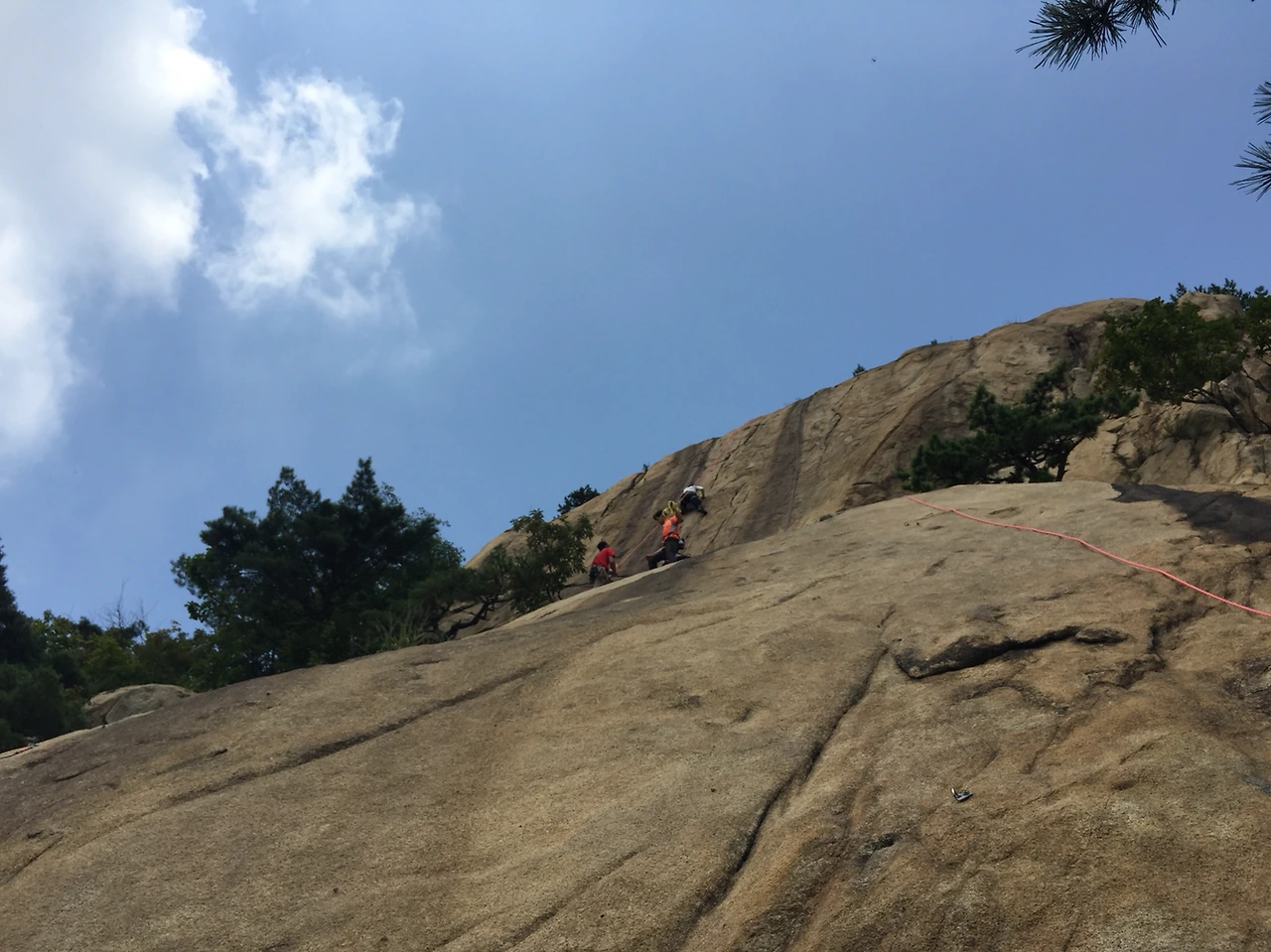 운동 한번 제대로 안 하고 오랜만에 바위에 오르는 길인데 그걸 알 턱이 없는 선배들이 1 피치를 선등 하라고 한다.