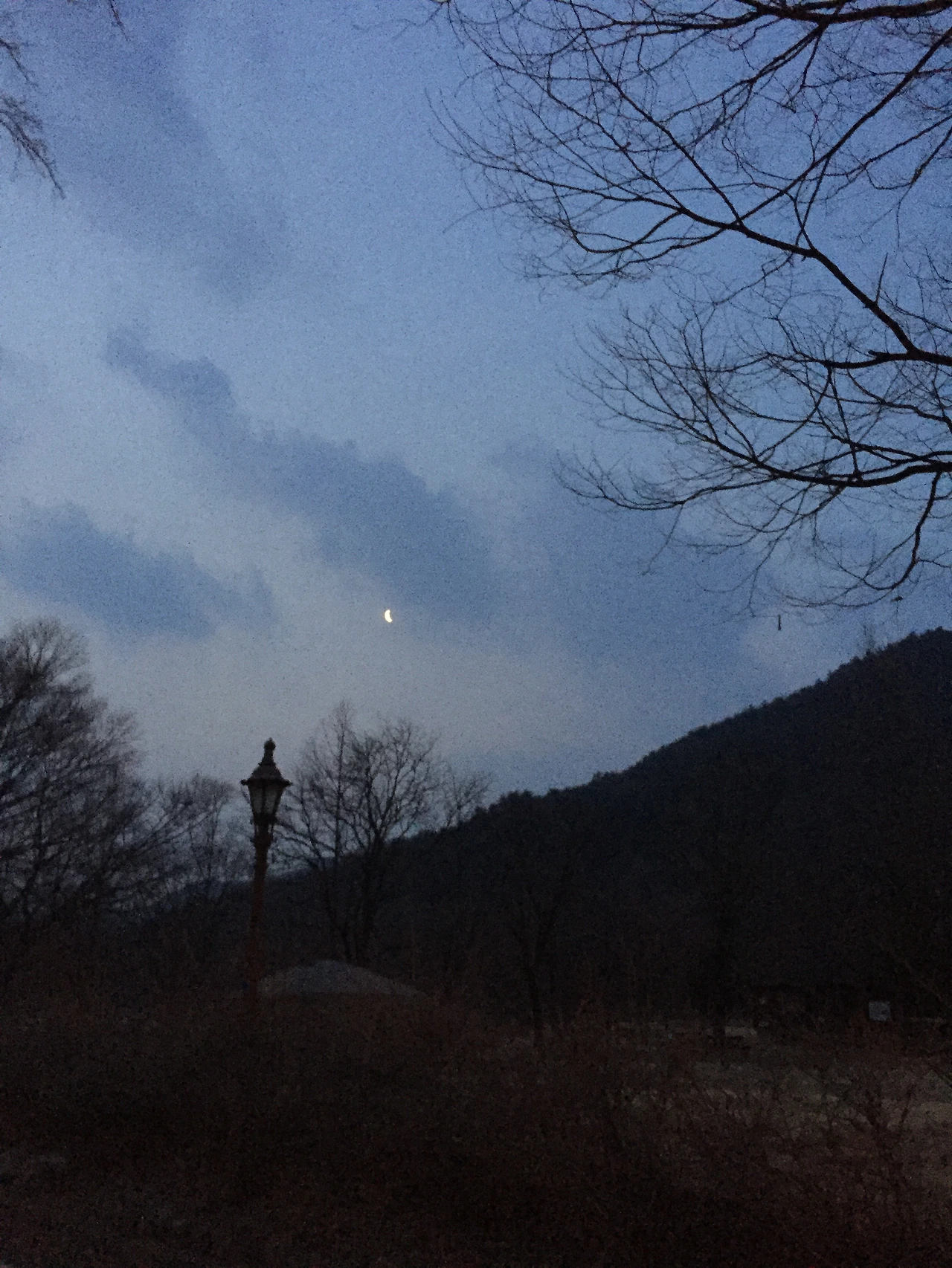 사람들의 훈련에 방해될까 조심스러워 어둠이 산으로 내려오기 전 얼음을 디뎠다.