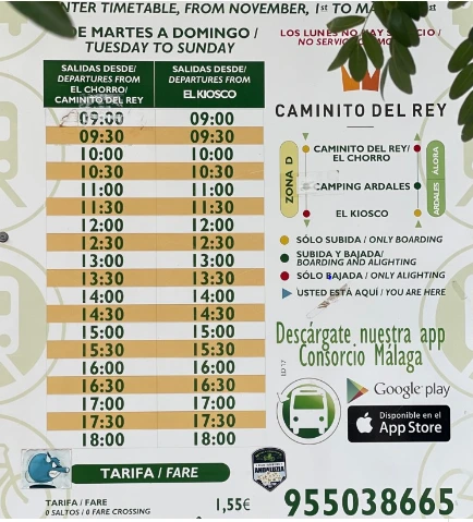 ** 셔틀버스 시간표 (Caminito del Rey 구매 후 공식홈페이지에서 구매 가능, 또는 현장에서 현금으로 구매 가능)
