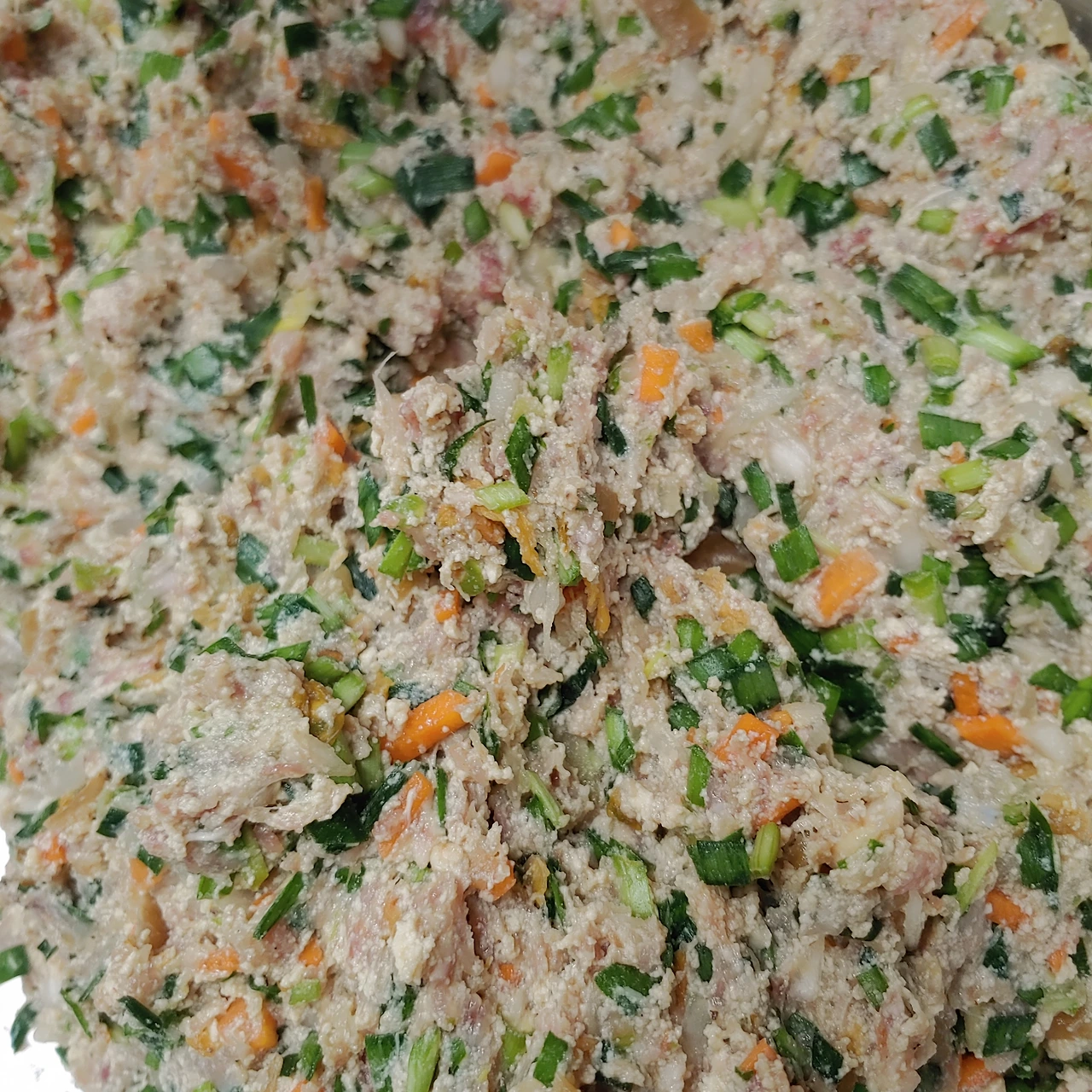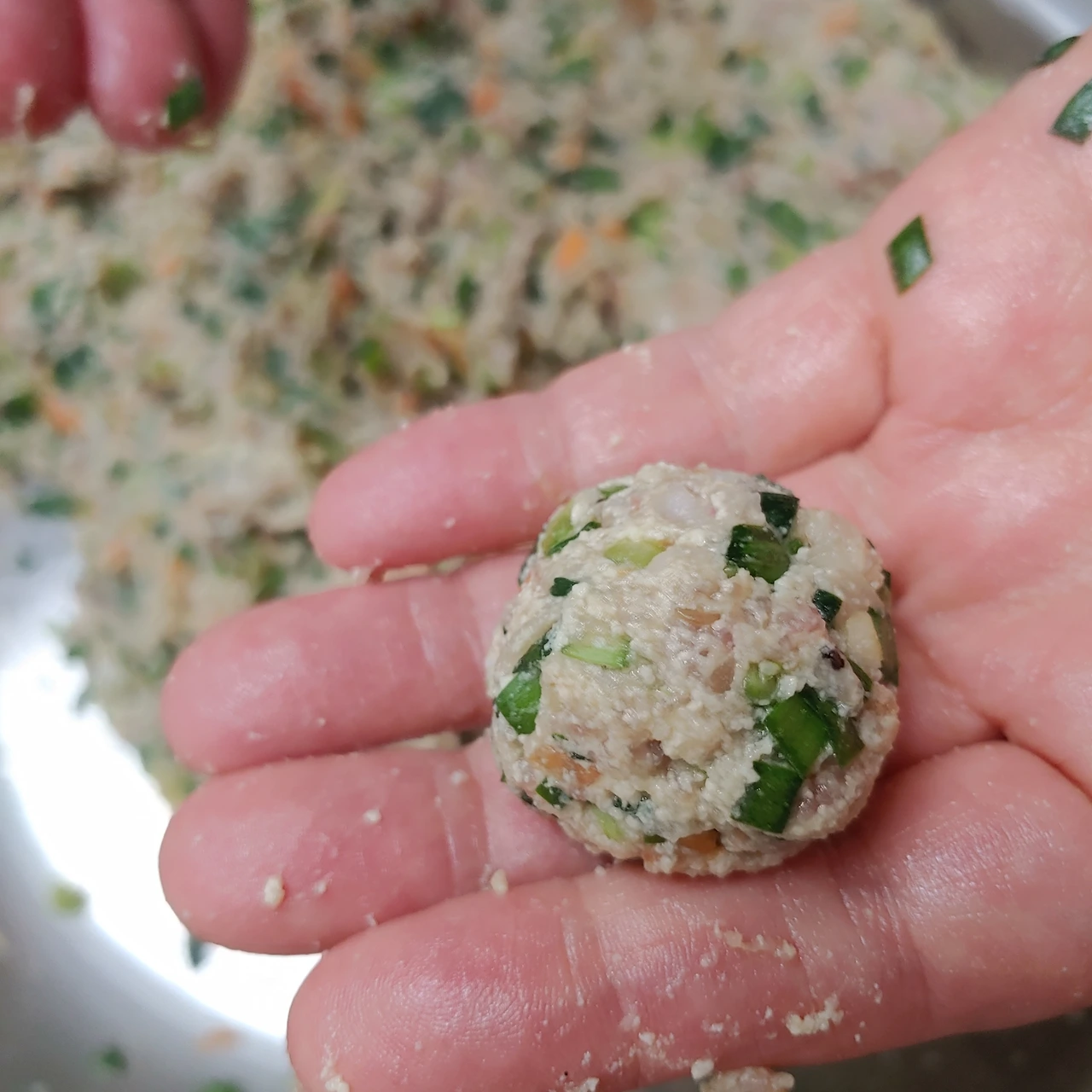 다진 돼지고기와 다진 소고기를 반반 섞어두고, 두부를 면포에 싸서 물기를 꼭 짠다. 으깨어진 두부에 부추, 당근, 양파, 청양고추를 다져 넣고 달걀도 깨 넣는다. 묵은지도 양념을 털어내고 찬물에 헹궈 꼭 짠 후에 곱게 다져준다. 고기의 누린내도 잡아주고 아삭한 식감도 내줄 것이다. 이 재료들을 모두 잘 섞고 후추와 소금을 뿌려 밑간을 해 준다. 피 없이 형태를 유지해야 하므로 반죽은 충분히 치대 주어야 한다.