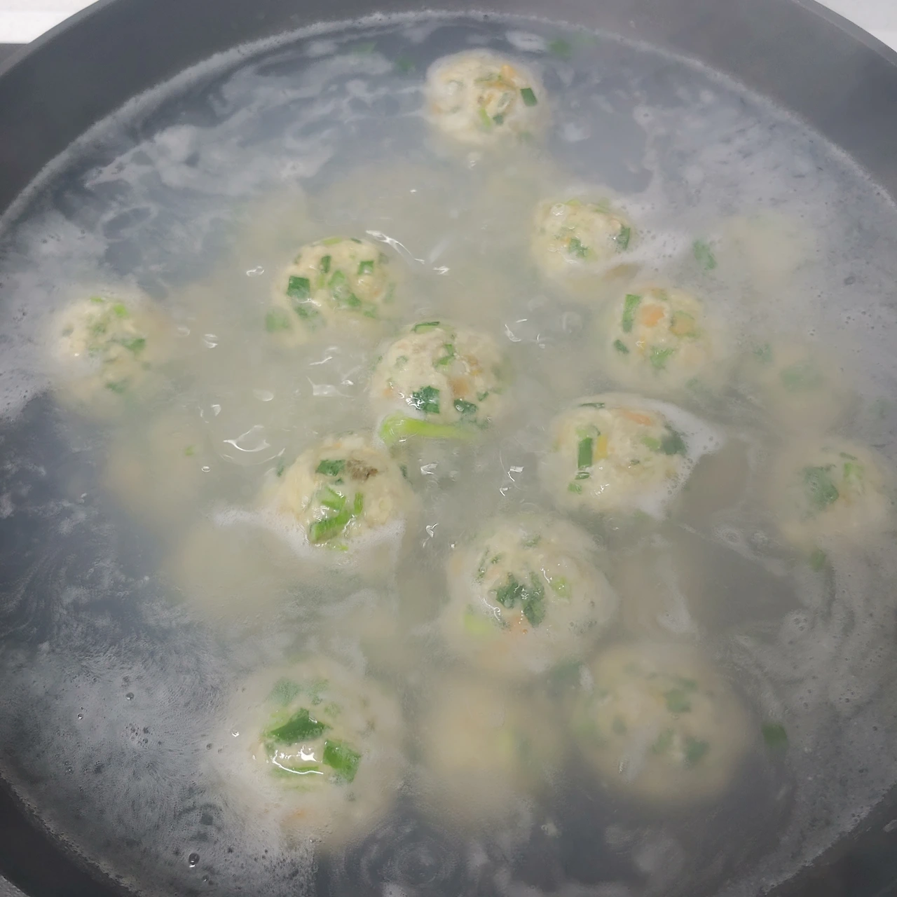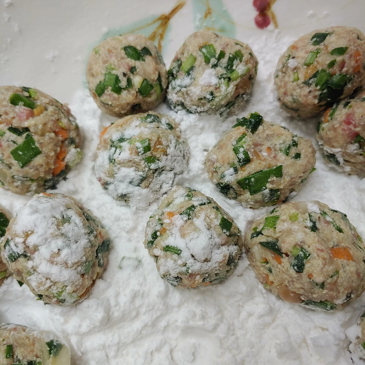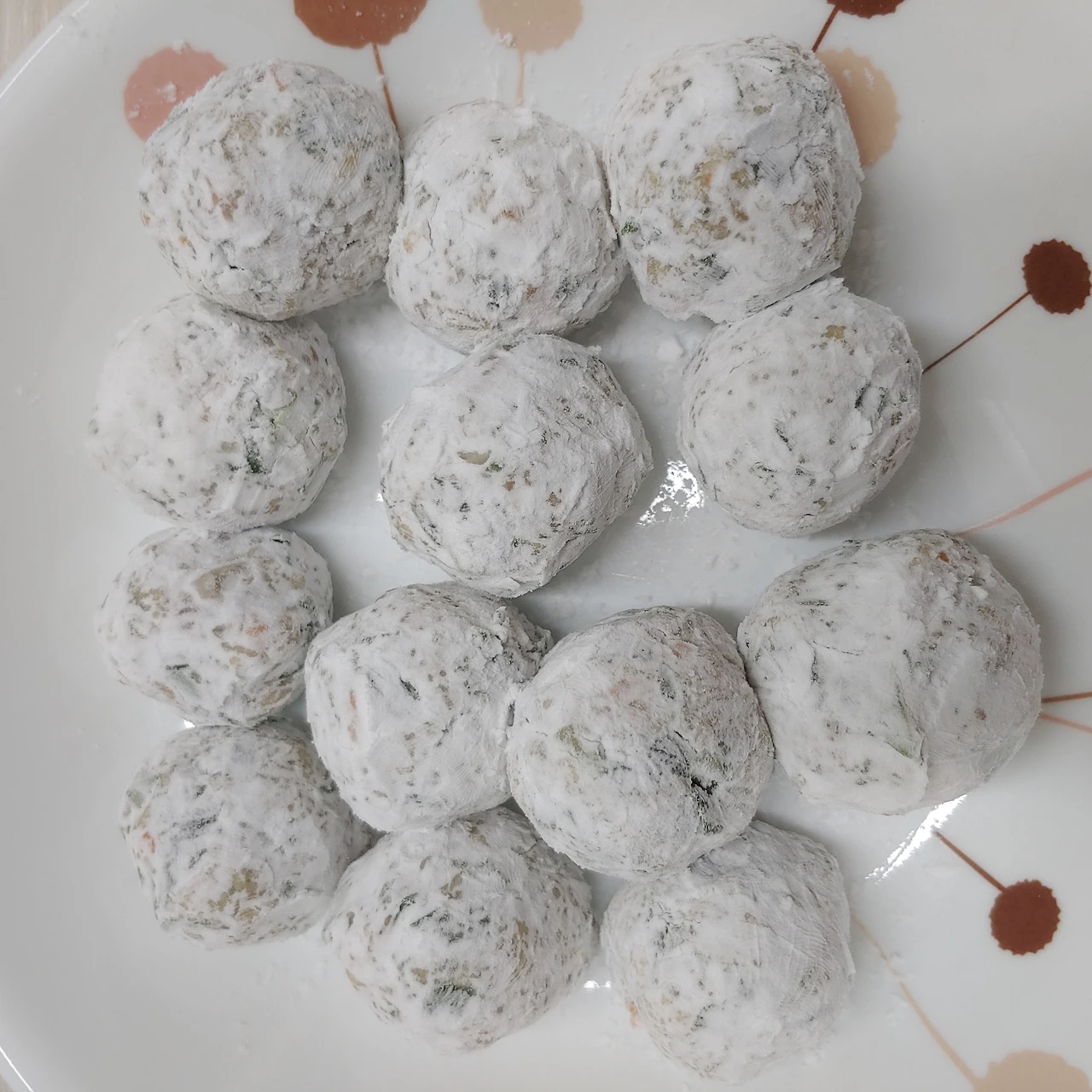 전분가루 옷을 입힌 만두 알을 준비하니 어느새 웍에서 물이 끓는다. 이렇게 굴려놓고 보니 ㄷㅋ도너츠에서 파는 먼치킨이 떠오르기도 한다.