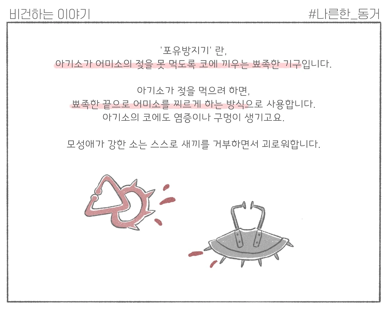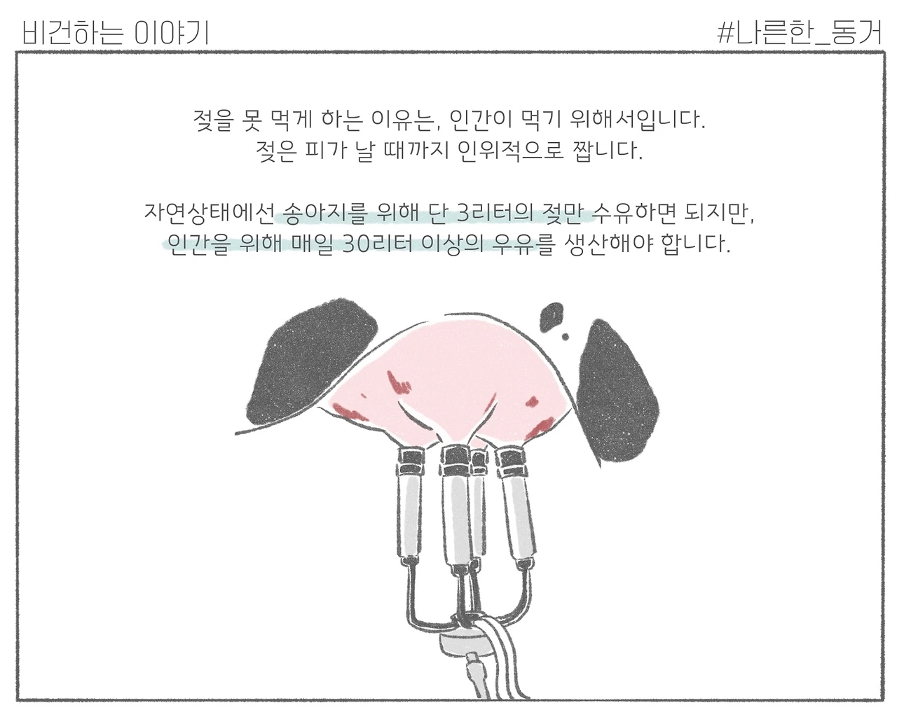 이때 새롭게 인지하게 되었던 건 젖소는 늘 젖이 나오는 게 아니라, 임신을 해야만 젖이 나온다는 것이고, 그건 송아지를 위한 젖이라는 것이었습니다. 이 당연한 사실을 수많은 미디어의 영향으로 전혀 인지하지 못했던 거에요.