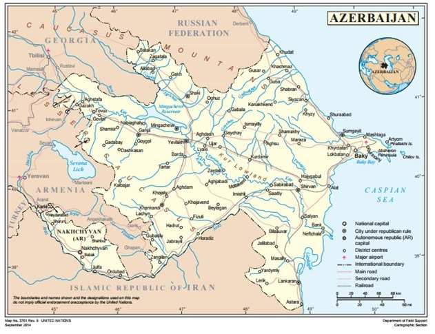 아제르바이잔은 캅카스 지역에 위치한 국가로 동쪽으로 카스피해와 맞닿아 있고 북쪽으로 러시아, 북서쪽으로 조지아, 서쪽으로 아르메니아, 남쪽으로는 이란과 국경을 마주하고 있습니다. 수도는 바쿠(Baku)입니다. (출처: UN)