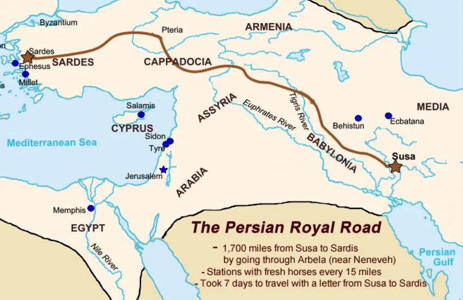 그림설명: 아제르바이잔 지역의 교역에 큰 영향을 끼친 페르시아 왕도는 교역뿐만 아니라 우체국의 역활을 하는 정류장이 있어 약24km마다 새로운 말들이 준비되어 있었으며 속도와 효율면에서 매우 뛰어났습니다. (출처: thinglink.com)