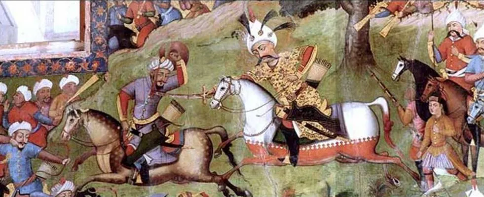 그림설명: 페르시아 사파비왕조의 창시자 샤 이스마일이 1501년 이란의 북쪽에 위치한 투르크메니스탄 지역에서 우즈베키스탄 지도자 모하마드 셰바니와 전쟁하여 승리하는 모습. (출처: IranChamber)