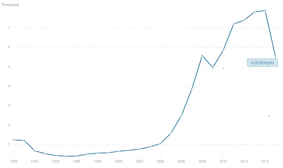 그래프 설명: 아제르바이잔의 1인당 국민소득. 2004년부터 고유가와 함께 소득이 급성장하여 2014년 1인당 US$7,886를 기록했으나 유가 하락으로인해 2015년에는 1인당 US$5,496으로 40%이상 하강하였습니다. (출처: 세계은행)