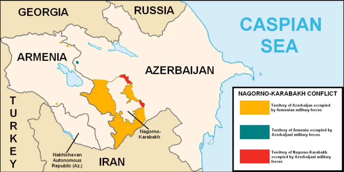 지도설명: 나고르노-카라바흐의 위치. 나고르노-카라바흐는 본래 아르메니아의 영토였으나 소련시절 이오시프 공산당 서기장의 행정 편의에따라 아제르바이잔 영토 내 자치 지역으로 바뀌었습니다. 주민의 80%가 아르메니아 출신인 나고르노-카라바흐는 아직도 아제르바이잔과 분쟁 중에 있습니다.