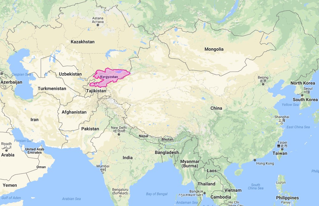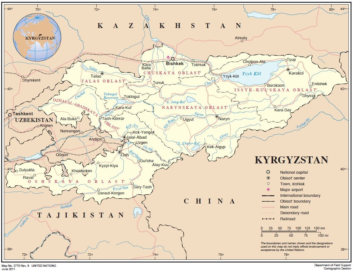 키르기즈스탄은 중앙아시아에 위치하고있으며 북쪽은 카자흐스탄, 동쪽은 중국, 서남쪽은 우즈베키스탄 및 타지키스탄과 국경을 맞대고있습니다. 수도는 비쉬켁 (Bishkek)입니다. (출처: UN)