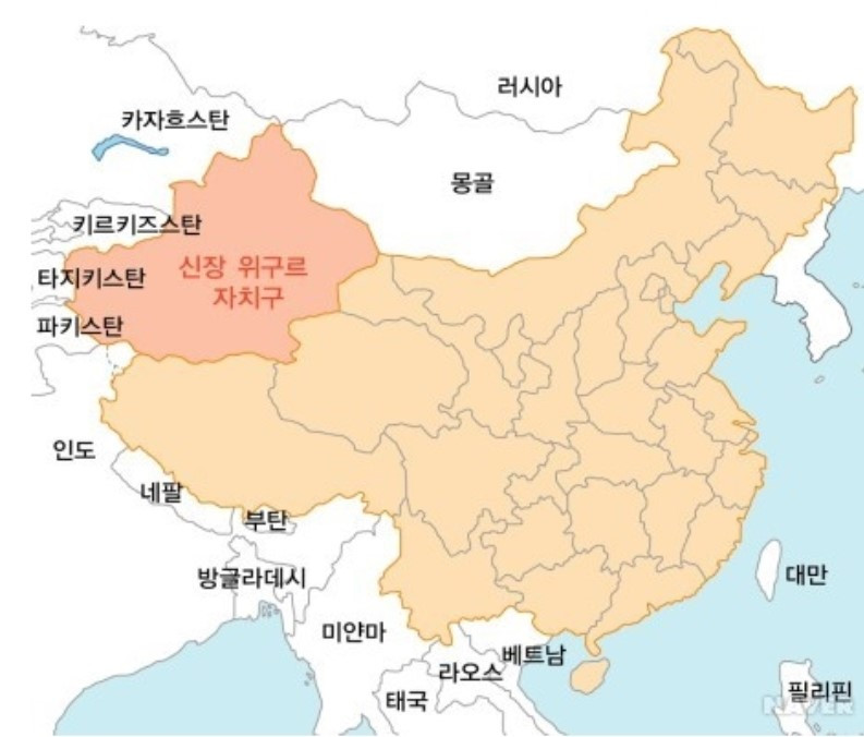 중국 북서부에 위치한 신장 위구르 자치구 (Xinjiang Uygur Autonomous Region)는 위구르족, 한족, 카자흐족, 후이족, 키르기스족, 몽골족 등의 다양한 민족적 구성을 이루고 있습니다. 신장(新疆)은 "새로운(新 신) 영토(疆 강)”을 뜻하며 위구르(ئۇيغۇر)의 뜻은 위구르어로 "단결"과 "연합"을 의미합니다. (지도 출처: 네이버 백과사전).