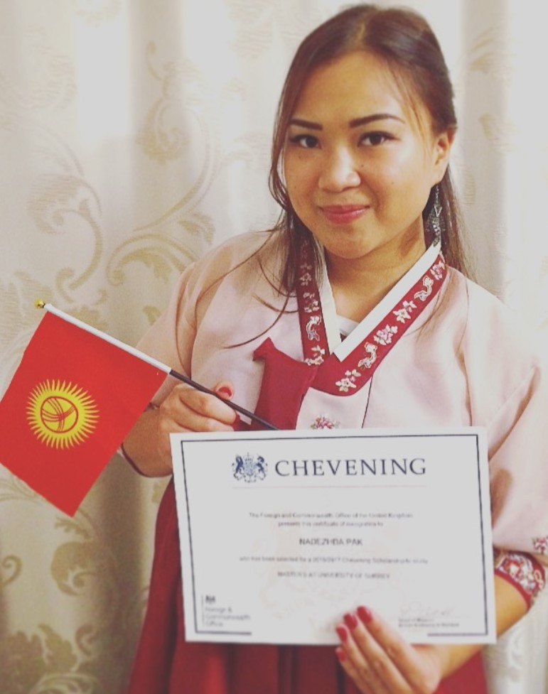 뛰어난 학업 성취 및 업무 능력으로 영국 정부 (Chevening) 장학생으로 선발된 키르기즈스탄 고려인 나디아 박씨가 한복을 곱게 입은 모습. 유창한 러시아어와 영어 실력으로 마나스 국제 공항의 금융 투자 분석과 인프라 개발 전문가로 활동했던 그녀는 영국에서 항공 교통 경영학 석사 과정을 이수하였습니다.