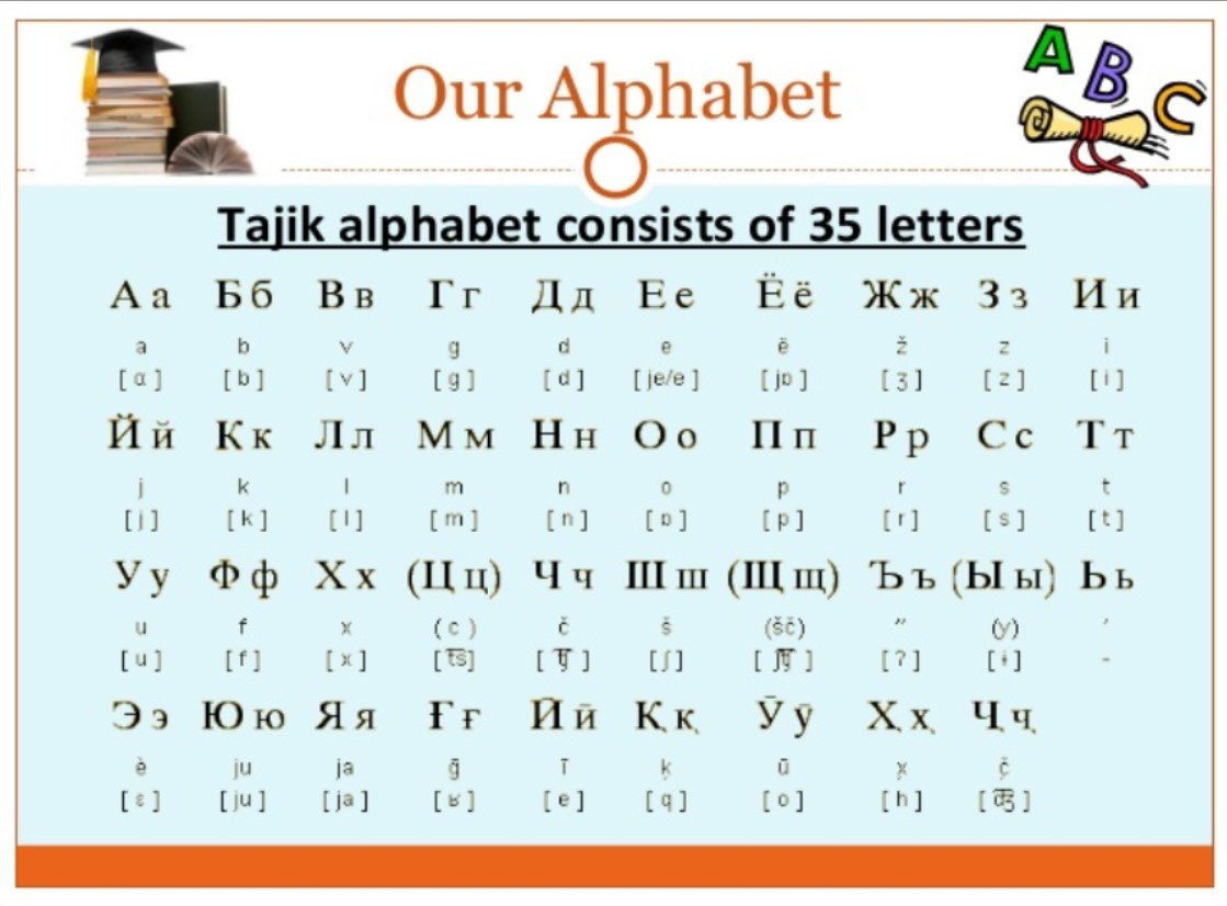 원래 페르시아-아랍 문자로 표기되었던 타지크어는1928년부터 러시아의 영향으로 러시아의 키릴 문자를 알파벳으로 사용해오고 있습니다. (출처: Oyatullo Mirzoev)