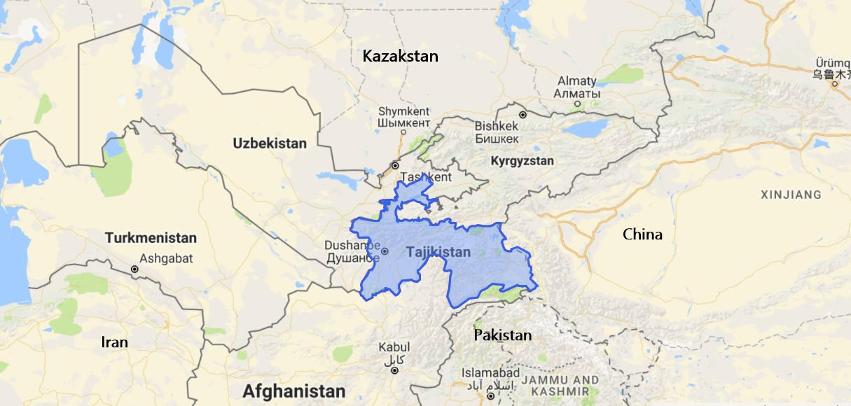지도설명: 내륙국가인 타지키스탄은 동쪽으로는 중국, 북쪽으로는 키르기즈스탄과 카자흐스탄, 서쪽으로는 우즈베키탄, 남쪽으로는 아프가니스탄과 접해있습니다. (출처: ZeeMaps)