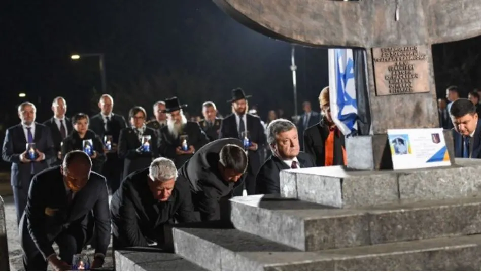 사진 설명: 2016년 9월 29일 우크라이나의 대통령 페트로 포로센코가 75년 전 키에브의 바비야르 (Babi Yar)계곡에서 일어난 나치 독일의 유태인 대량학살의 희생자 추모식에 참석하고 있습니다. 약 3만4천명의 유태계 우크라이나인이 학살당한 이 사건은 제 2차 세계대전 중에 일어난 가장 규모가 큰 유태인 학살 중 하나로 알려져있습니다. (출처: Shahar Azran / WJC)