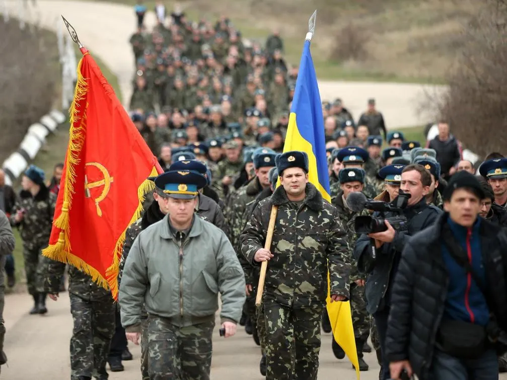 사진 설명: 2014년 3월 우크라이나의 육군대장이 비무장한 군사들을 이끌고 크림 반도의 벨벡공군기지 (Belbek airbase)를 러시아 군사들로부터 재탈환하기 위해 전진하는 사진입니다. (출처: independent.co.uk)