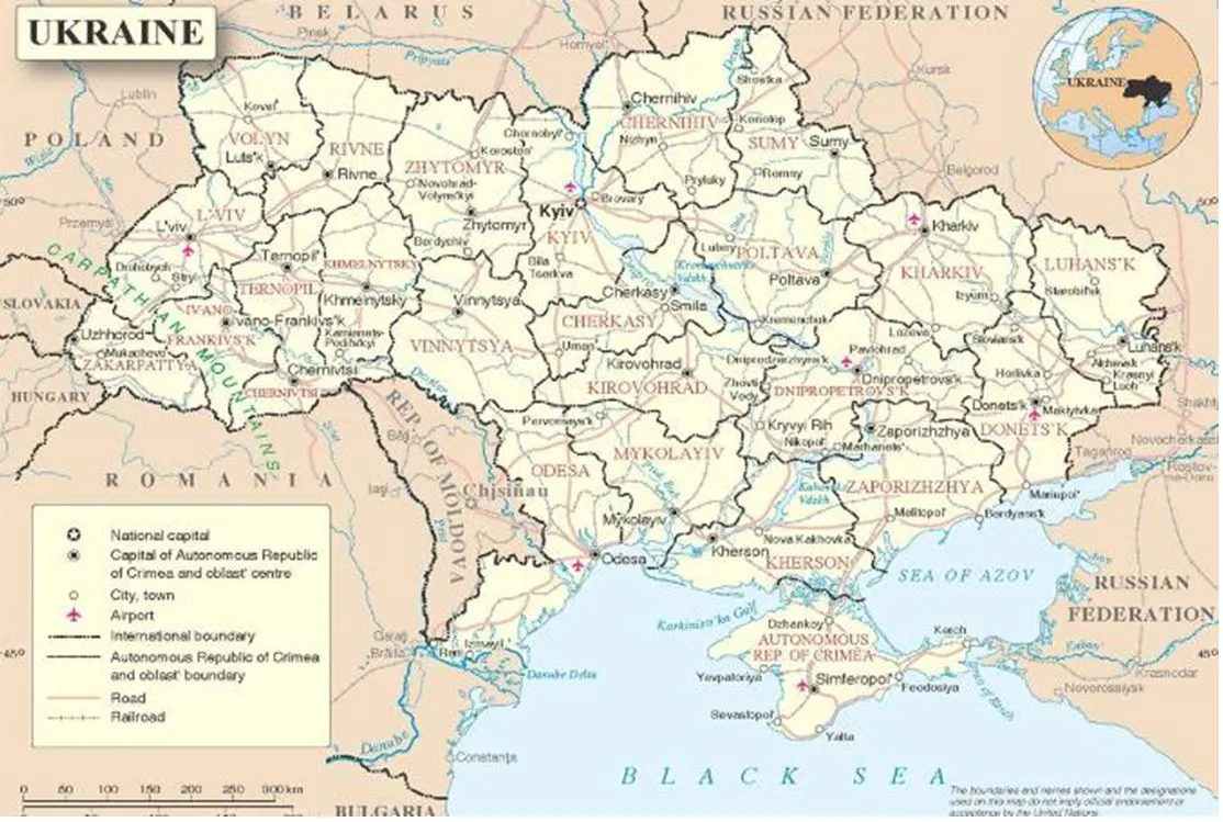 지도 설명: 우크라이나는 북쪽으로 러시아와 마주하고 서쪽으로는 벨라루스와 폴란드, 서쪽으로는 슬로바키아, 헝가리, 몰도바, 루마니아와 국경을 맞대고 있습니다. 남쪽은 흑해와 아조프해가 위치하고 있습니다. 수도는 키에브 (Kiev)입니다. (출처: UN)