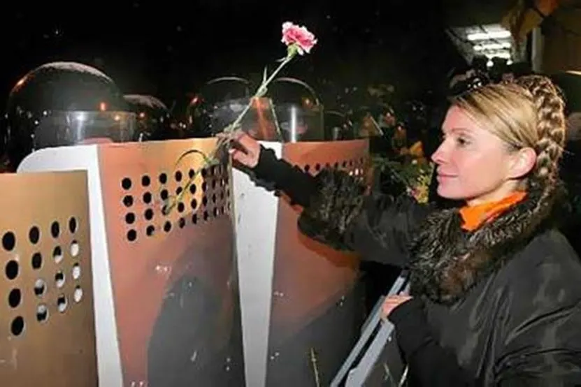 사진설명: 2004년 오렌지 혁명 당시 데모시위를주도하였던 율리야 티모셴코가 대치하던 경찰에게 꽃을 건네주고 있습니다. 율리야 티모셴코는 유셴코가 대통령에 당선된후 총리로 임명되었습니다. (출처: http://ambassadors.net/)
