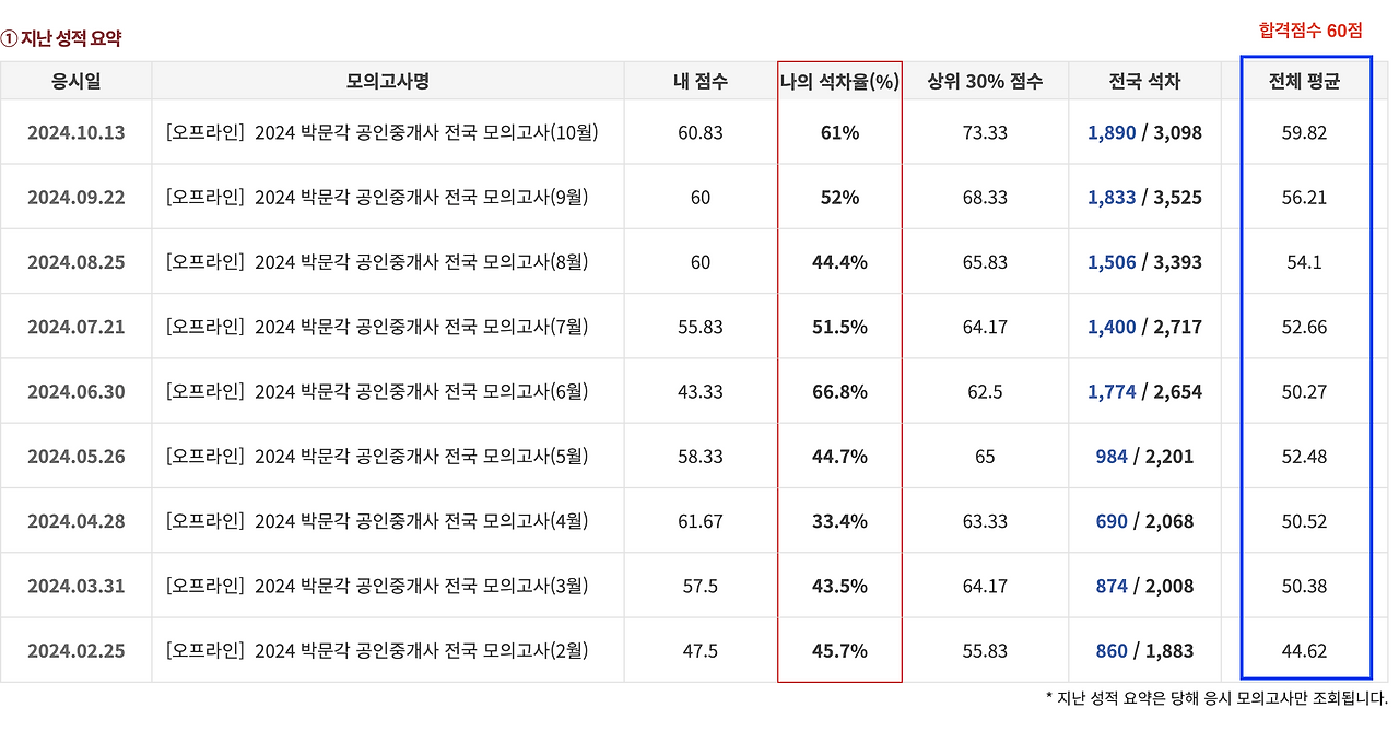 기출을 한 번이라도 스쳐간 문제는 모두 쓸어담아야 할 것 같았다. 그렇게 갈퀴질하듯, 닥치는 대로 문제를 풀었다. 결국 진도를 따라가지 못했고, 진도에 대한 부채감은 이자에 이자를 낳았다. 시험은 10월이었고, 나는 9월까지 총 아홉 번의 모의고사를 봤다.