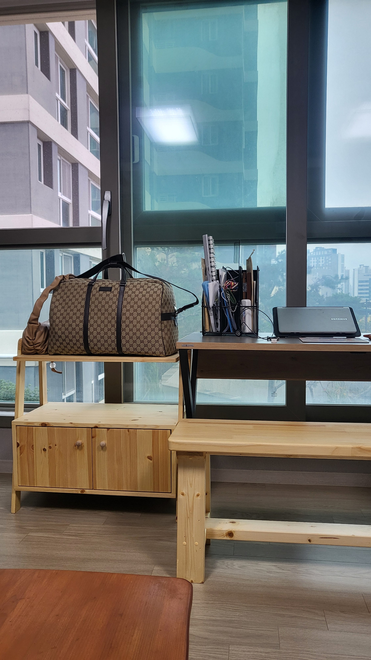 여닫이 서랍장은 레드파인 나무로 만들었는데 문짝 두 개에 경첩을 달면서 문에서 비치는 핑크베이지의 나무 속살을 볼 때마다 어찌나 사랑스러운지... 나중에 손녀딸을 보게 되면 이런 기분일까? 완성된 두 개의 작품을 오늘 집에 데려와서 어루만지는 내 눈빛에 꿀이 뚝뚝 떨어졌나 보다.