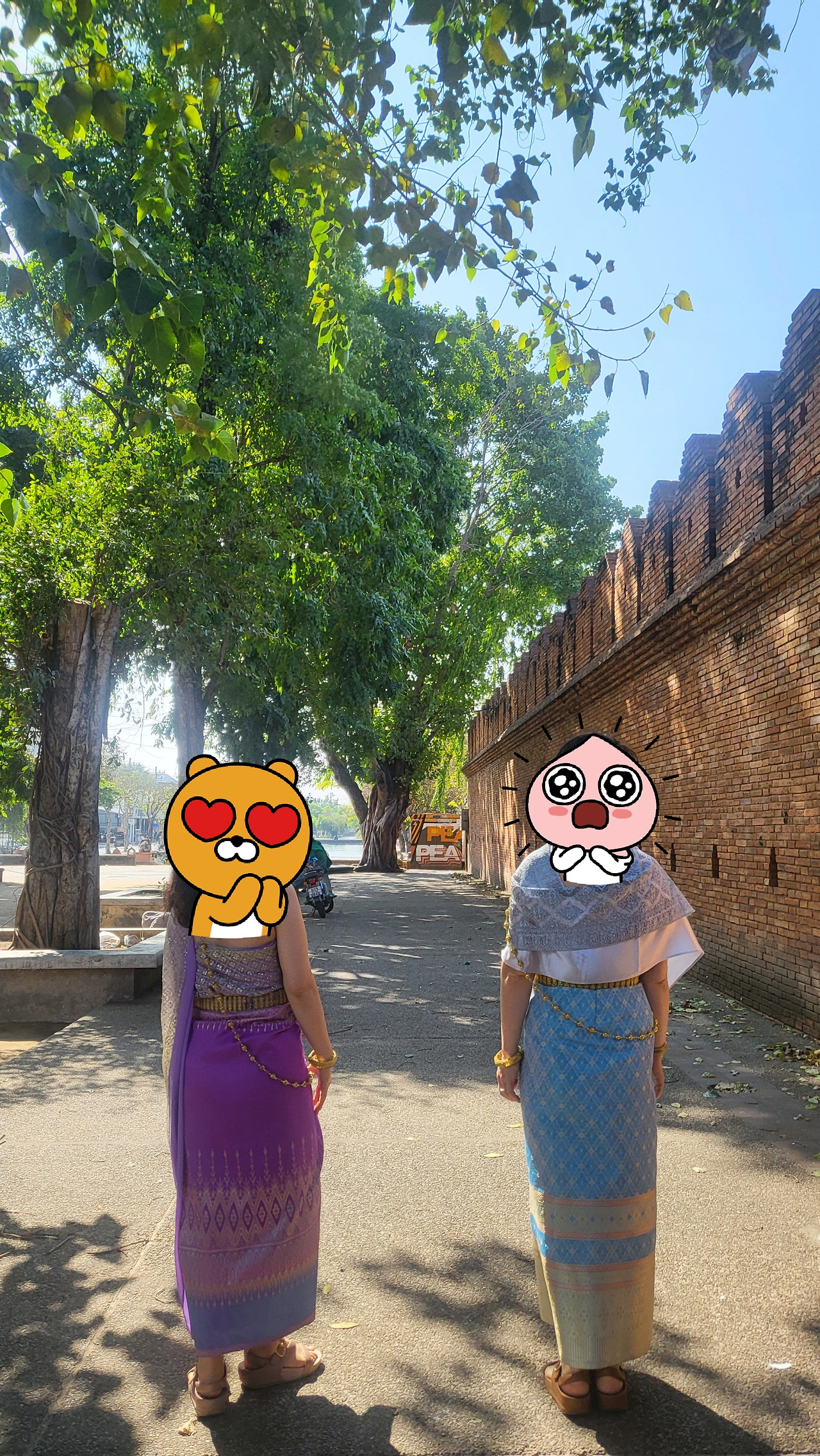 아침 첫 일정은 태국 전통 의상 입고 태국 왕실 유적지 가서 사진 찍는 체험으로 시작했다. 친구는 보라색을 나는 하늘색에 금박 무늬 있는 걸로 골라서 화려한 골드 팔찌에 목걸이를 주렁주렁 달고 나갔다.