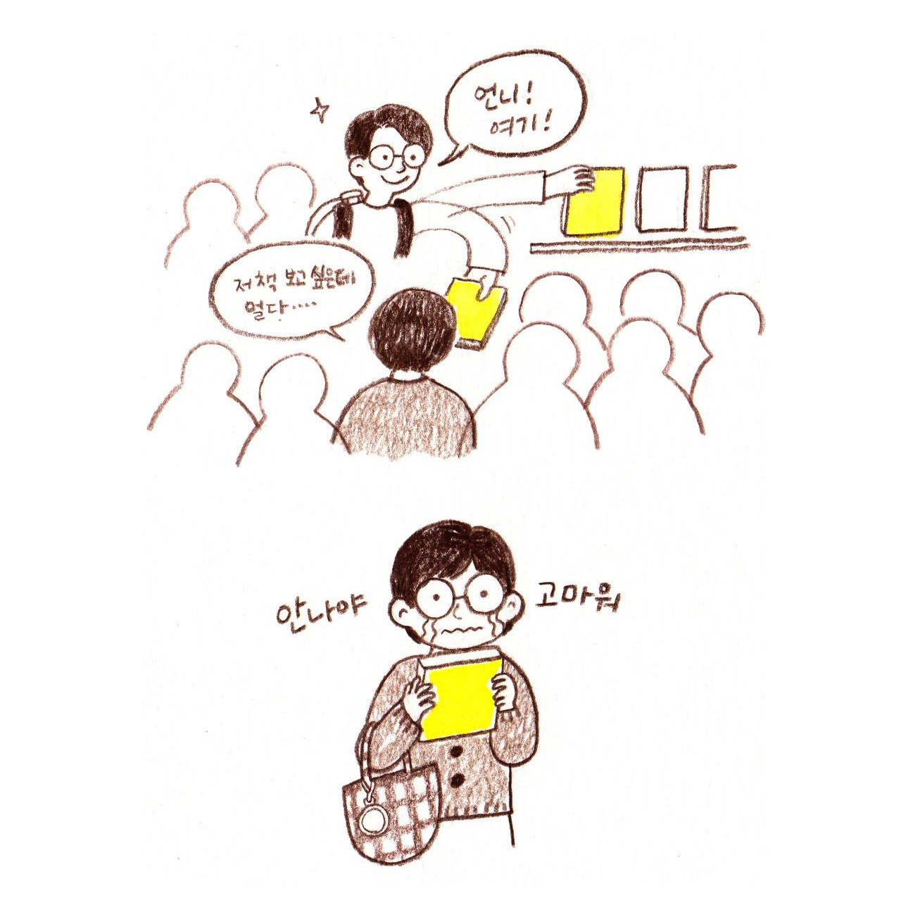 책을 보러 다닐 때 안나와 나의 취향이 엇갈리는 점도 무척 재미있었다. 우리가 유일하게 같이 산 책은 독일에서 유학 중인 김주영 작가님(instagram.com/joo_bilder)의 책 <Unübersetzbare Deutsche Wörter 번역이 안 되는 독일어 단어들>이었다. 마침 오늘 김주영 작가님이 직접 작업을 소개하는 시간이 열려서 함께 가서 들었는데 그림이 너무 귀여웠다. <번역이 안 되는 독일어 단어들>은 말 그대로 독일어 단어를 한국어로 번역할 때 연상되는 재미있는 이미지들을 모아, 작가님 특유의 재치 있는 일러스트 작업으로 엮은 작업물이었다. 우리는 강연을 듣고, 바로 부스에 내려가 작가님의 책을 사고 사인도 받았다.