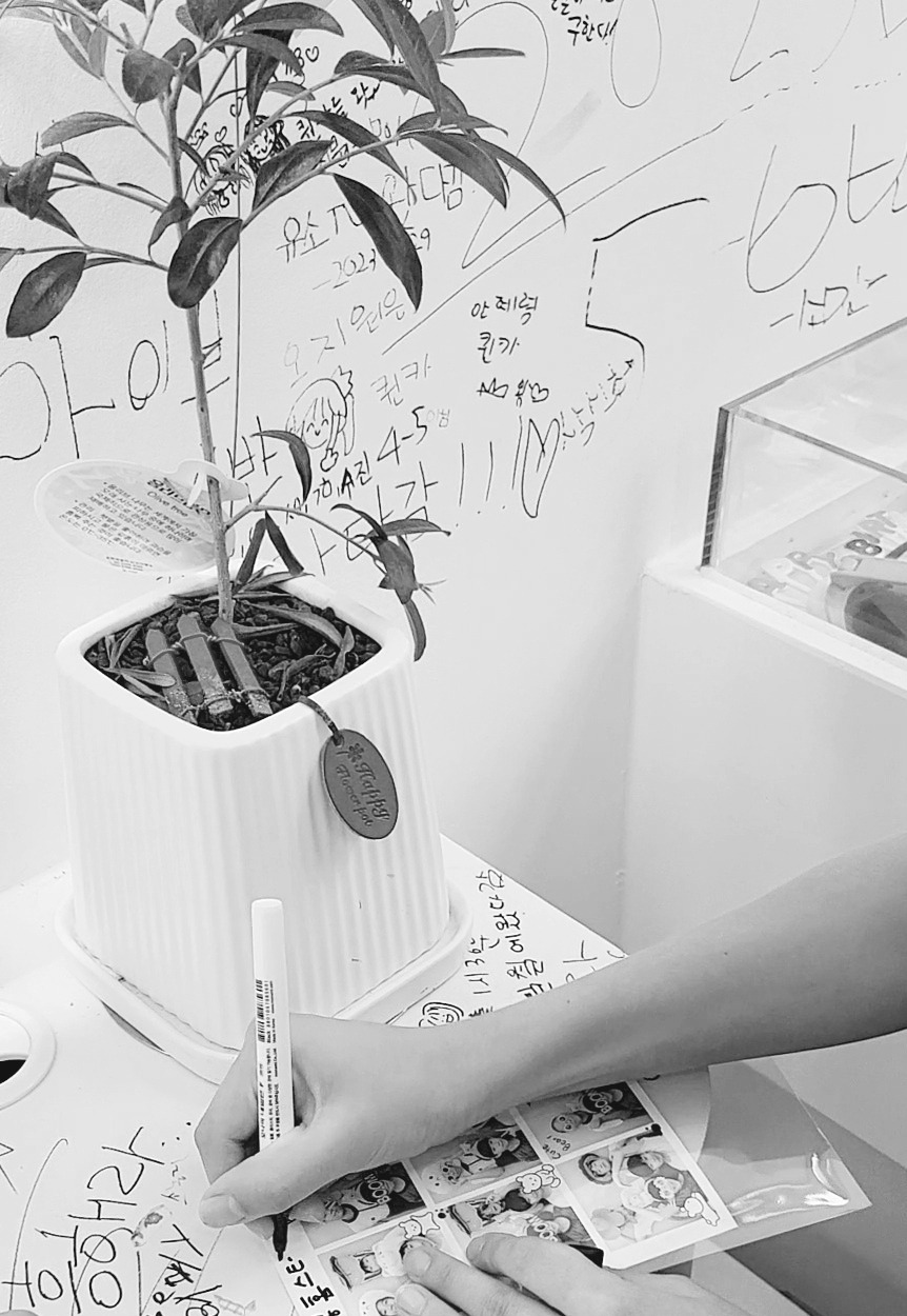 지금 우리 집 냉장고에는 넷이서 찍은 6컷짜리 사진이 붙어있다. 마지막 날 아침, 학교로 떠나기 전 셀프 사진관에 들러 알록달록 가발과 선글라스를 끼고 아이들끼리 찍은 사진이다. 인화된 사진에 한 아이가 매직으로 무언가를 쓰자, 다른 아이들도 따라 썼다. 그러고는 이 컷은 어떻고, 저 컷은 망했고, 저마다 손에 든 똑같은 사진을 들여다보며 아이들은 연신 품평회를 해댔다, 학교로 향하는 30분 내내. 학교에 도착해서는 구겨지지 않게 넣은 것을 확인하고 더플팩 사이드 지퍼를 닫았다. 아이들이 매직으로 쓴 글씨를 떠올리면 왠지 모르게 코끝이 찡해진다.