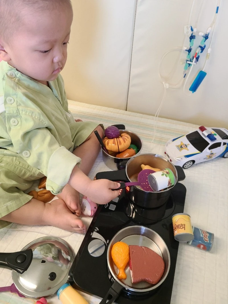 1차 때는 공간이 협소하니 짐을 최소화 하시라는 병원측 안내를 최대한 준수하려고 노력했었다. 그런데 막상 한 번 해보니, 아무데도 못나가고 먹지도 못하고 침대에만 있어야 하는 아기가 그나마 잘 놀 수 있게 장난감을 많이 가져와야 겠다는 생각이 들었다. 내가 장난감 더미 위에서 잠을 자더라도 은우의 배고픔, 답답함, 통증, 짜증, 불안 등을 잊게 해줄 판타스틱하고 어메이징한 장난감들이 필요했다.