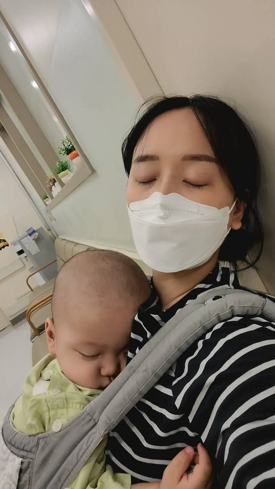 다만 몇 분이라도 더 자게 하려고 살살 빵빵해진 기저귀를 갈고 조용히 아기띠로 안는다. 기계에 연결된 파워 코드를 뽑고 폴대와 유모차를 양손으로 하나씩 밀면서 복도로 나간다. 폴대에는 여분 마스크, 은우 신발, 물티슈, 핸드폰, 태블릿, 은우 담요와 가디건 등을 챙겨놓았다.