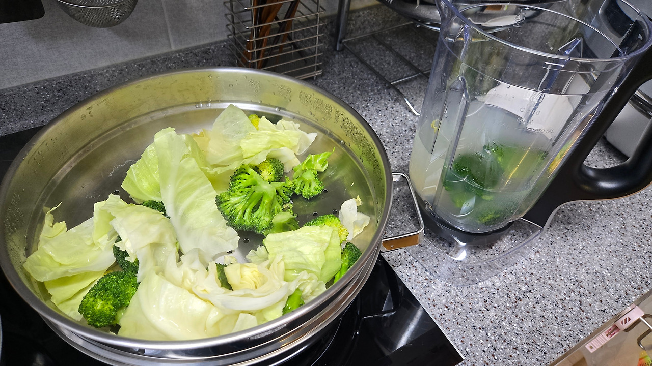 -녹색 스무디: 물 600ml, 위와 동일한 레몬즙 100ml, 찜기에 5분 정도 찐 브로콜리 300g(x팡에서 조각으로 300g씩 판매하는 것 한 번에 모두 사용), 브로콜리 찔 때 같이 찐 양배추 한 줌, 아보카도 퓌레 100g(x팡에서 구입), 파슬리 한 줌, 바나나 1개