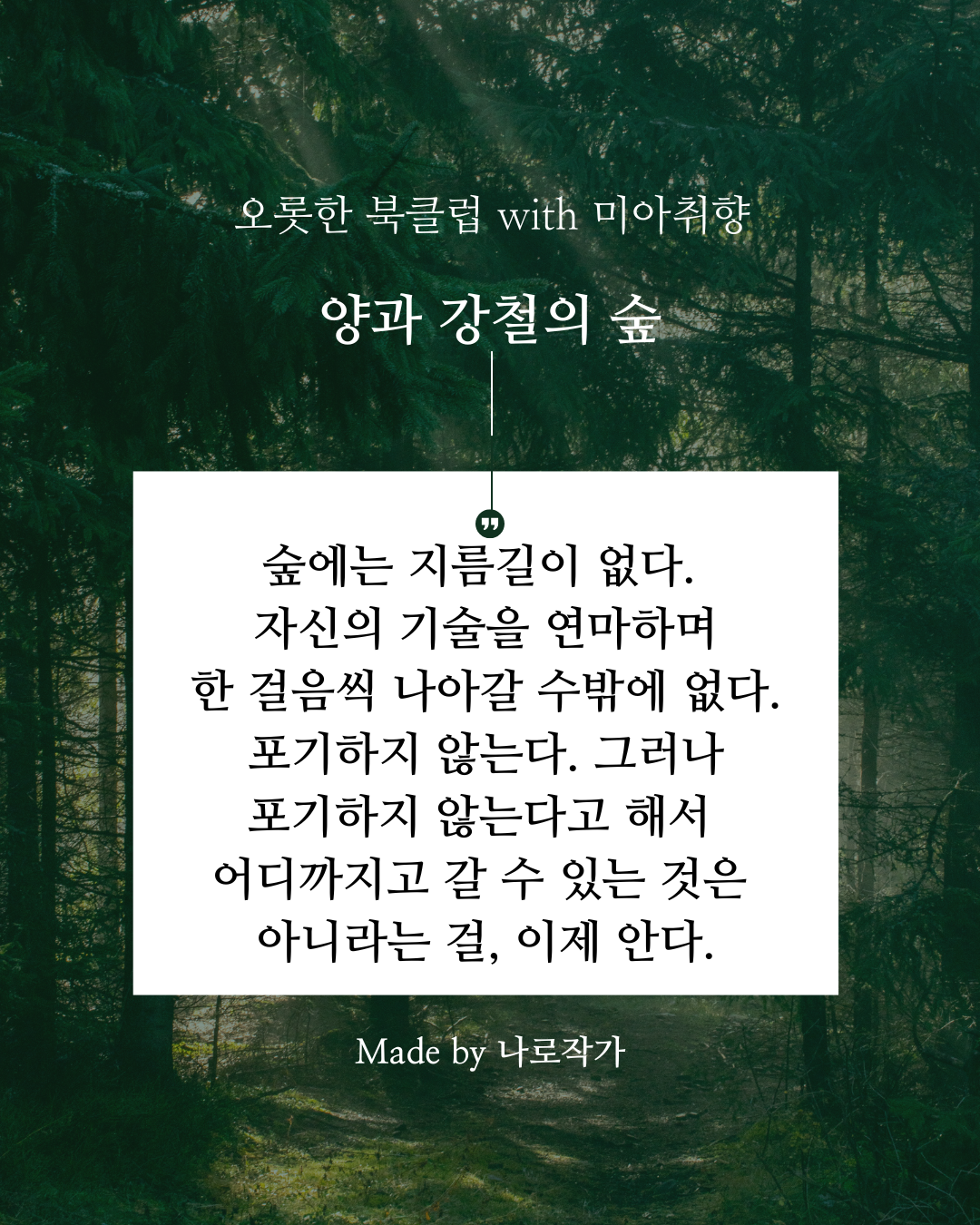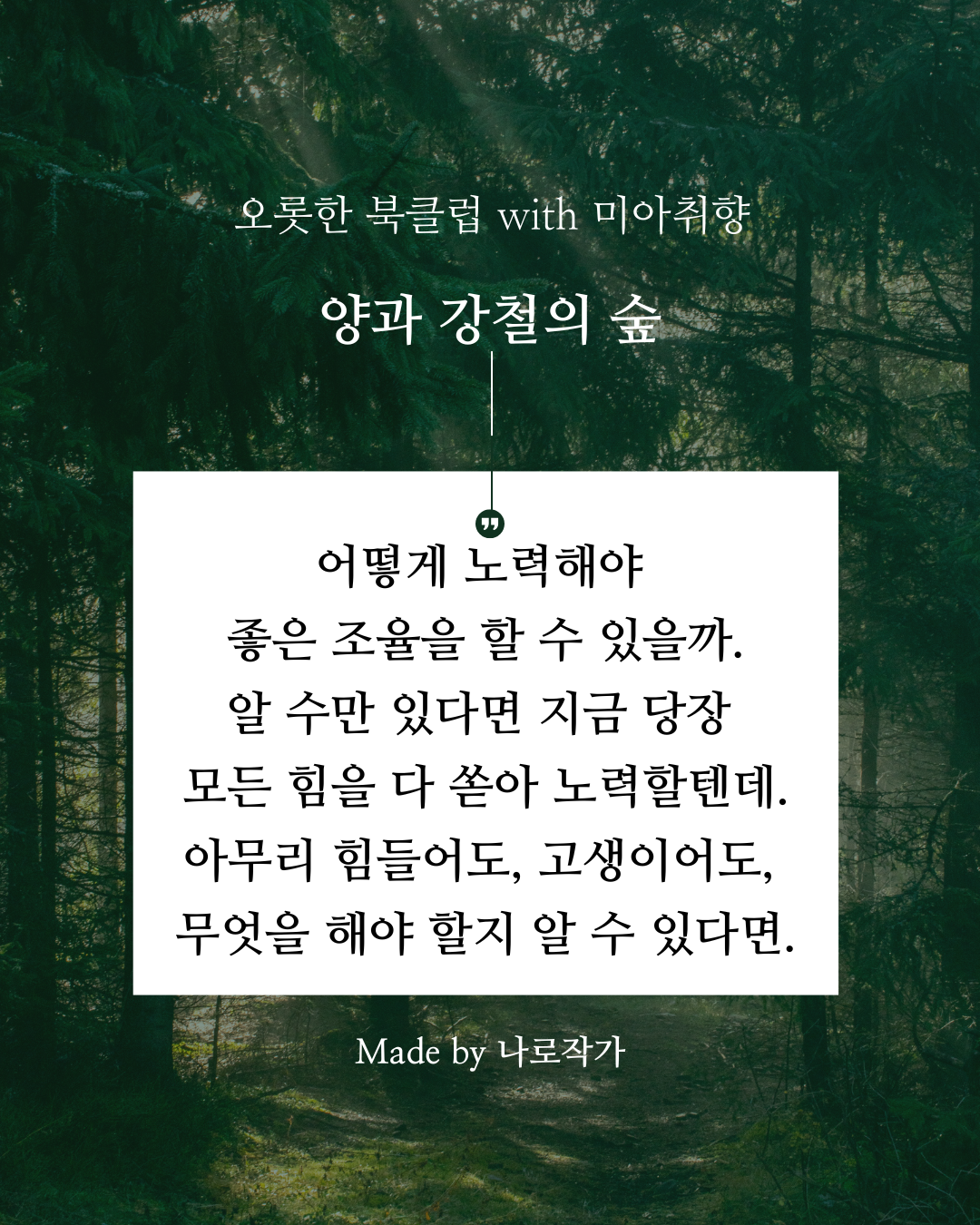 '길이 험준하다. 저 앞까지 너무 멀어서 어떻게 노력해야 하는지조차 보이지 않는다. 처음은 의지, 마지막도 의지. 그 사이에 있는 것은 분발이거나 노력이거나, 혹은 분발도 노력도 아닌 다른 무언가이거나.'