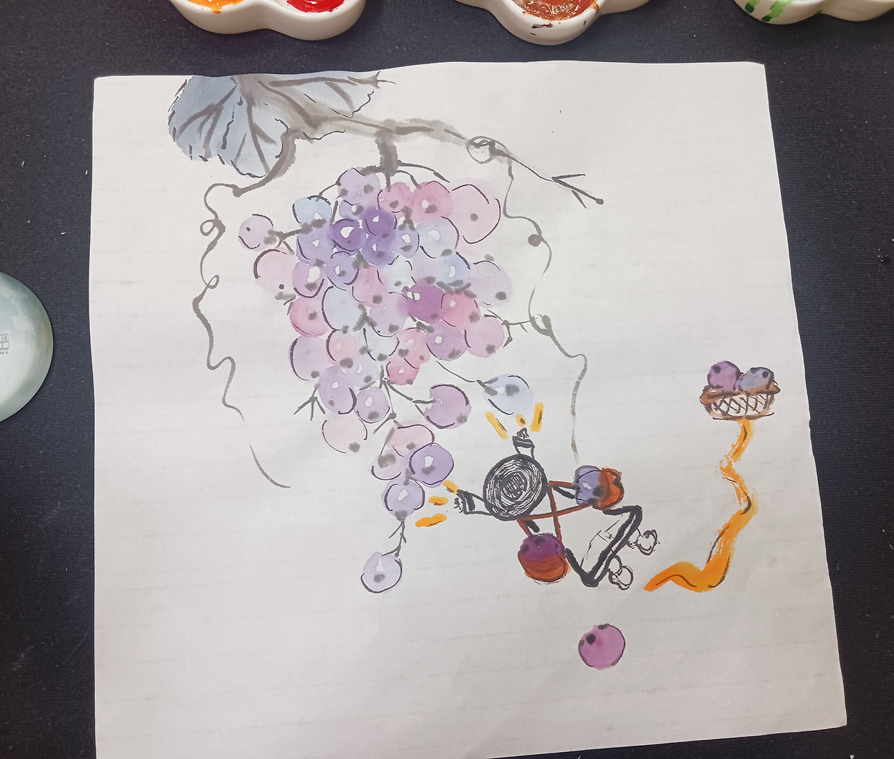 "예예... 어째 이번엔 꽃이 아니라 포도알 위에 계시는군요~?"