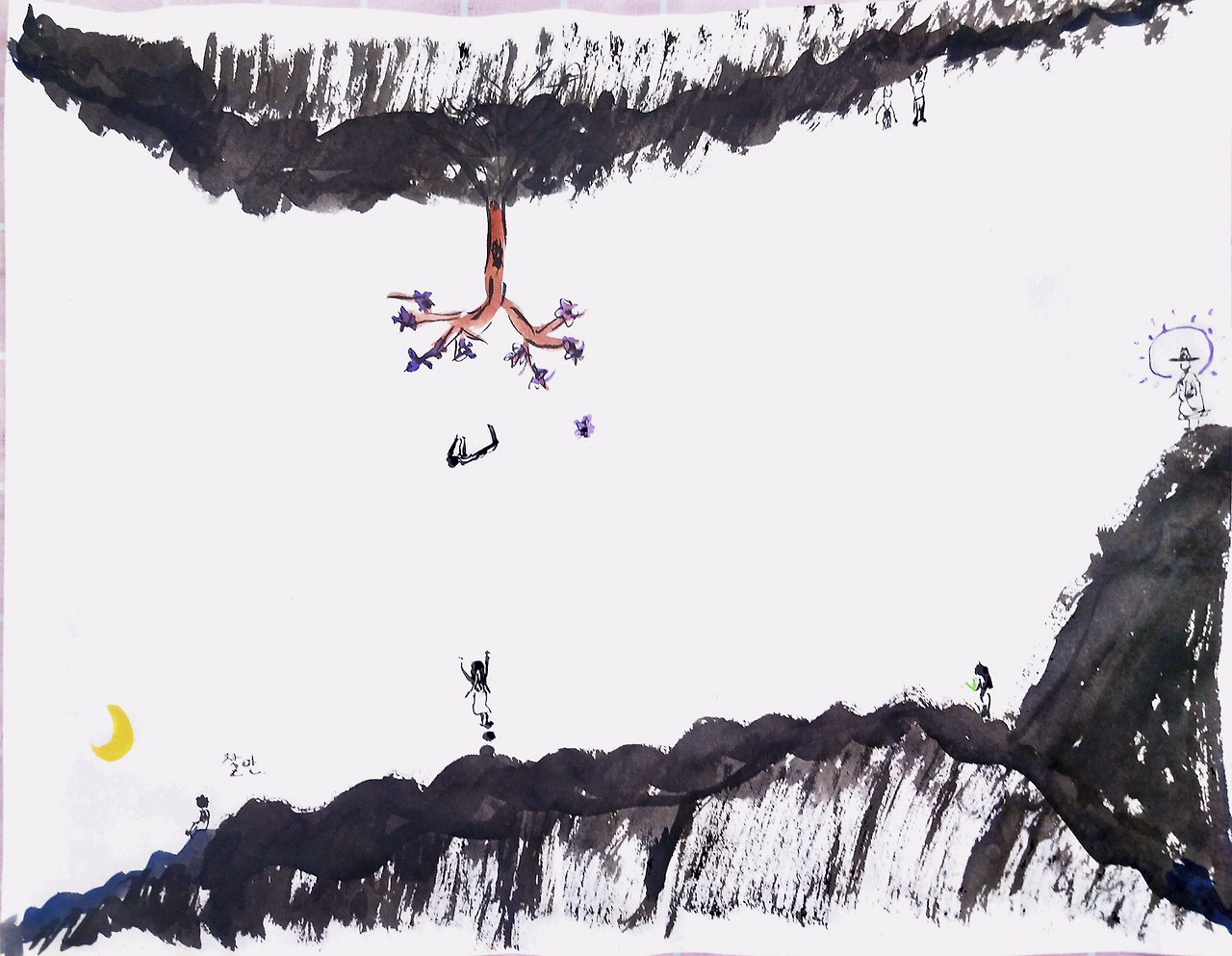 휘리릭 하고 허공을 가로질러 날아서 멀리 어떤 산중턱 절벽 위로 올라갔다.