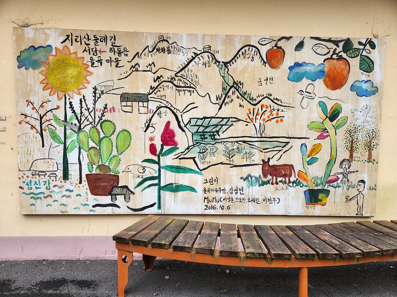 둘레길 있는 안내 표지판은 검은색과 빨간색이었지만 여기서 다른 색이다. 우리 아이들에게 물어보면 알아맞힐까. 어느 쪽이든 녹색, 녹색으로 되어 있다. 금방 서당 0.8km, 하동읍 6.2km라고 쓴 표지가 나왔다. 반듯하게 길가에 서서 양손을 펼치고 있는 자세가 믿음직스러웠다. 율곡 마을이었구나. 장승이 서 있는 집을 지나서 벽에 그림 지도를 그려놓은 데까지 금방이었다. 그 동네 뒷산 구재봉이 그려져 있고 그 뒤로 천왕봉이 그려져 있다. 우리는 바람재를 따라 걸어가야 한다. 바람재 윗길은 돌땡이라고 쓰여있고 바람재 아래는 밤봉, 그 아래는 율곡지라는 못이 있는가 보다. 그래, 바람재를 다 오른 지점에 구재봉 등산로 안내판이 있었다. 거기서 길이 갈렸다. 우리는 반대편이다. 물 좀 마시고 숨도 고르자. 무슨 맛? 살겠다는 저 표정들을 보니 살아 있다는 것이 이런 거다 싶다. 어떤 산이든 힘들다. 거기가 어디든 오르막이 있고 내리막이 있다. 하지만 힘들고 싫은 것만 가진 것은 또 없다. 누구나 누군가에게는 희망이다. 우리가 사는 세상은 지리산에 비하면 너무나 넓고 광활하다. 거기에는 거대한 동력이 든다. 큰 덩치가 움직이는 데 소모되는 것들이 여기 지리산에 비할 수 있을까. 그래서 어지럽고 심란하고 두렵다. 이기기 위해서 살고, 살기 위해서 이겨야 한다. 목욕탕에 들러 목욕을 하고 나오는 것처럼 지리산에 들렀다. 곧 때가 묻고 다시 더러워질 것이다. 피곤하고 졸릴 것이다. 그때 우리는 목욕하면서 산을 걷는다. 여기서 씻고 밖에 나간다. 학교에 가고 친구를 만나고 돈을 번다. 내가 받는 돈에 산 내음을 묻힌다. 돈 썩는 냄새만큼 견디기 힘든 것이 없더라는 어느 경찰관의 말을 기억하기 때문이다.