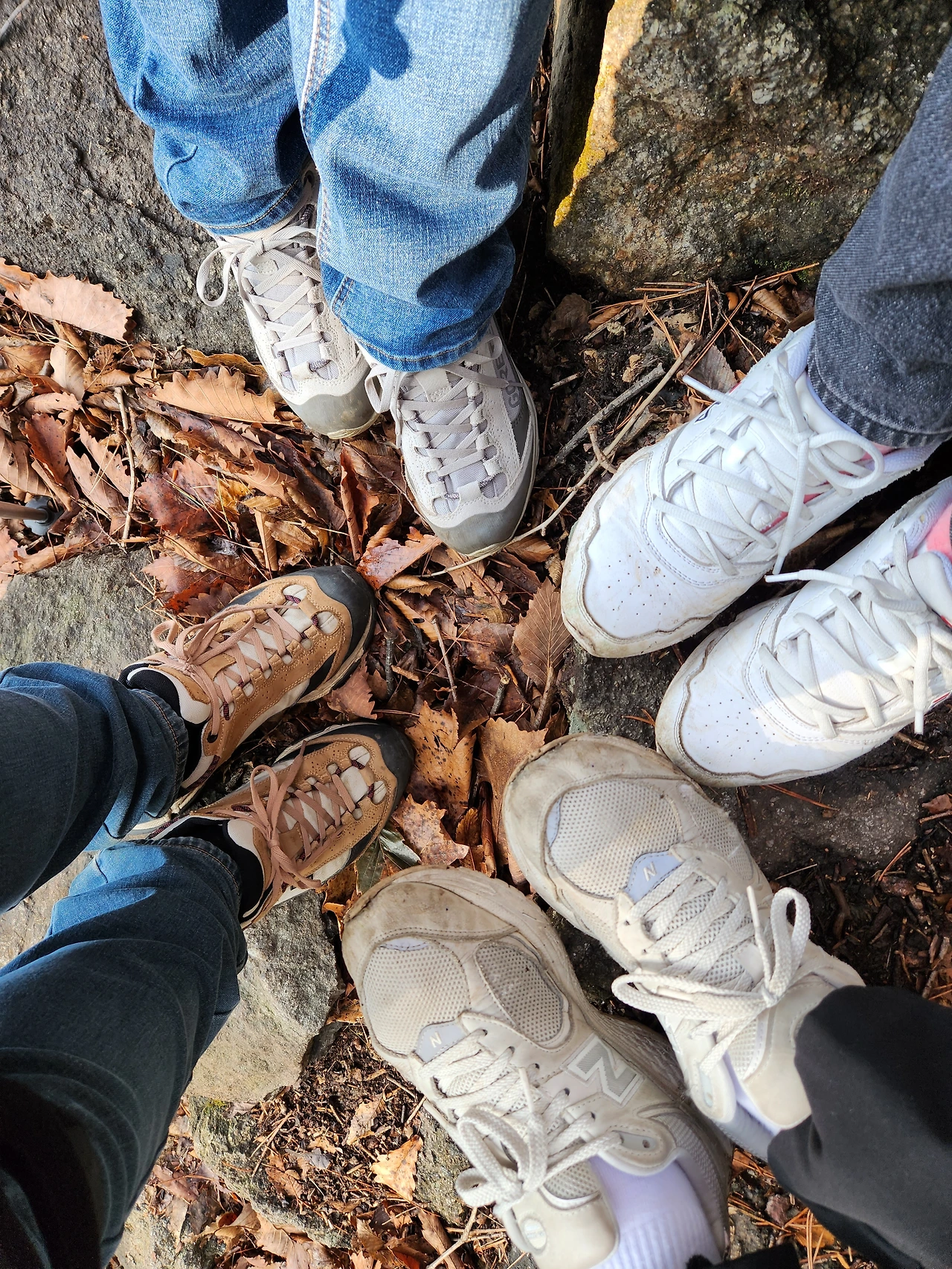 말이 난 김에 넷이 발을 한 데 모으고 사진 한 번 찍자. 처음으로 그런 제안을 했다. 어? 뭐지, 이 복고 감성은? 산이 신발이 가장 해졌다. 산에 올 때는 낡은 것이 편하다고 일부러 신고 왔던 신발인데도 안 돼 보였다. 산이에게도 적당한 등산화를 사줘야겠다. 강이는 신발 깔창을 따로 만들어서 신고 다니는 터라, 지금 그대로 운동화를 신고 다니면 된다.
