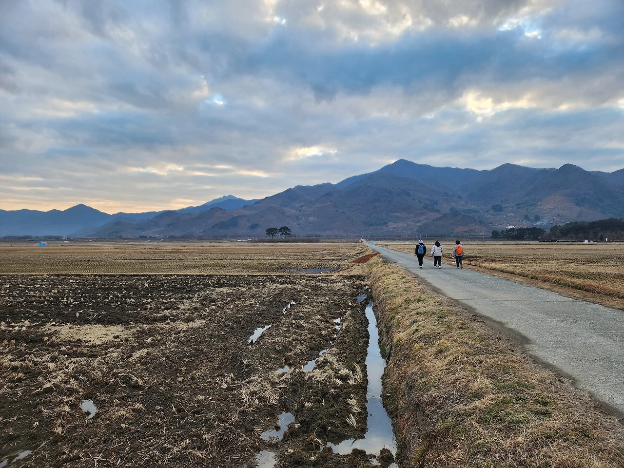 산을 내려오다 들어선 마을이 입석마을이다. 거기서는 평사리 들판이 눈에 들어온다. 저 건너편 산에서 대축마을로 내려오면서 바라봤던 가을날 그 노랗던 들판이 텅 비어 있다. 저 산에서 이 산으로 넘어오는 동안 계절도 바뀐 것이다. 그 가을에 걷지 못했던 들판을 오늘은 한복판으로 가로질러 걷는다. 부부송이 멀리서도 모습이 근사하다. 저기까지 간다. 석양이 지고 산 그림자가 내려앉는 평사리 들판을 앞에 셋, 뒤에 내가 걷는다. 이쯤 되면 영화의 한 장면이다. 소설에 나오는 대목이어도 어울릴 것 같다. 잘 걷는구나, 너희들.