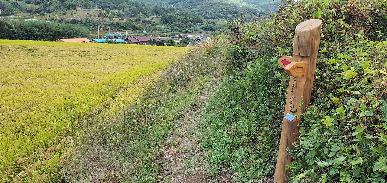 다행히 비가 내리지 않았고 선선해서 좋았다. 한 십 리쯤 더 걸어도 좋을 것 같았다. 한밭 마을 앞에서는 걸음이 저절로 멈췄다. 비를 뿌렸던 구름이 급하게 어딘가로 서두르는 모습이 작고 아담한 산골 마을을 배경으로 그림 같았다. 비슷비슷한 크기의 산들이 둥글게 원을 그리며 마을을 감싸고 마을로 들어서는 너른 들판에 수확을 앞둔 벼가 한창이었다. 성심원 4.3km라고 쓰인 표지판도 찍어본다. 어쩌면 지리산 둘레길에 서 있는 많은 길 안내 화살표 중에 배경을 멋지게 소화해 내는 그런 표지판이 되지 않을까 생각했다. 앞으로 마주치게 될 다른 화살표들도 기대된다.