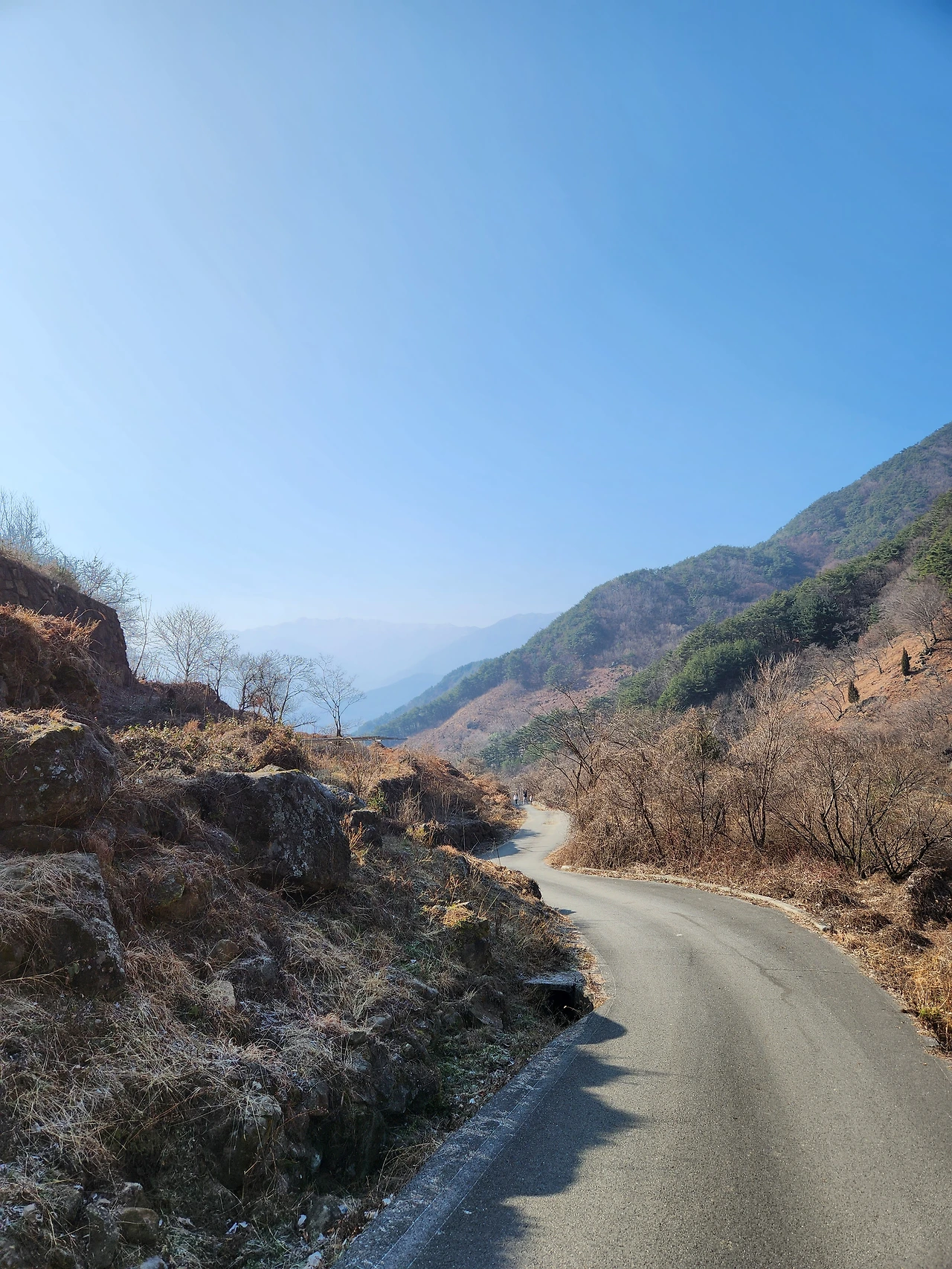 볕은 환한데 바람은 차가운, 꼭 온천이다. 오르막을 오르면 금방 몸이 후끈해진다. 바깥이 추워도 속은 달아오른다. 거기가 숨이 사는 곳이다. 숨결, 호흡은 그 변화가 심오해서 사람을 살리기도 하고 까무러치게도 한다. 산기슭에서 부는 2월 순풍은 그대로 얼굴로 달려든다. 무수한 키스 세례다. 호흡이 순간적으로 거칠어진다. 입맞춤, 바람에 흥분한다. 노란 별이 서 있던 자리에서 출발을 기념하며 사진을 찍었다. 남쪽 하늘이 뻥 뚫렸다. 빈 나뭇가지도 전봇대도 쪽빛 하늘을 뒤로 두고 기지개를 켠다. 다들 좋은 날이다. 포장도로가 길게 뻗어있다. 여기를 여름에 걸어서 오른다면 그것은 또 얼마나 많은 인내심을 필요로 할까. 무조건 내가 걷는 오늘이 가장 좋은 날인 줄을 나는 안다. 벌써 까마득히 뒤떨어진 세 사람을 멀리서 찍는다. 산이가 손을 흔드는 이 사진 어디에서 그를 찾을 수 있을까. 보이지 않지만 분명히 저기 있다. 저 끄트머리에 아이가 있다. 중학교 3년, 그리고 고등학생이 되어서도 우리와 동행하는 너는 멋있다. 한참을 올라왔는데도 활공장 7km라는 표지판을 보고 나도 믿어지지 않았는데 너희는 어떤 심정이었을까. 오르막을 7km 더 간다는 것이 어떤 의미인지 우리는 너무 잘 안다. 벌써 그만두고 싶은 마음이 윙크를 보낸다. 각오를 다지듯이 나는 나를 찍었다. 도로에 비치는 내 그림자가 어쩐지 믿음직스러웠다. 긴 머리카락을 오른손으로 쓸어내리면서 삼거리에서 왼편으로 들어섰다. 아직 12시도 안 됐잖아. 물이 흐르는 소리에 마음을 건넸다. 흥미가 떨어질 때는 물에게, 겁이 날 때는 꽃에게, 막연할 때는 하늘에게 나를 맡긴다. 그것이 내가 세상을 지나온 방식이다. 이제 서서히 서로들 실력 차이가 난다. 산이가 치고 나가고 강이가 뒤로 쳐진다. 나는 강이를 연거푸 찍는다. 그대의 힘든 시간을 기록하는 것이 내 악취미다. 앞서가는 아이의 뒷모습은 언제나 편안함을 준다. 엄마와 아들이 나란히 간다. 두 사람 종아리가 제법 야무지게 자세를 잡았다.