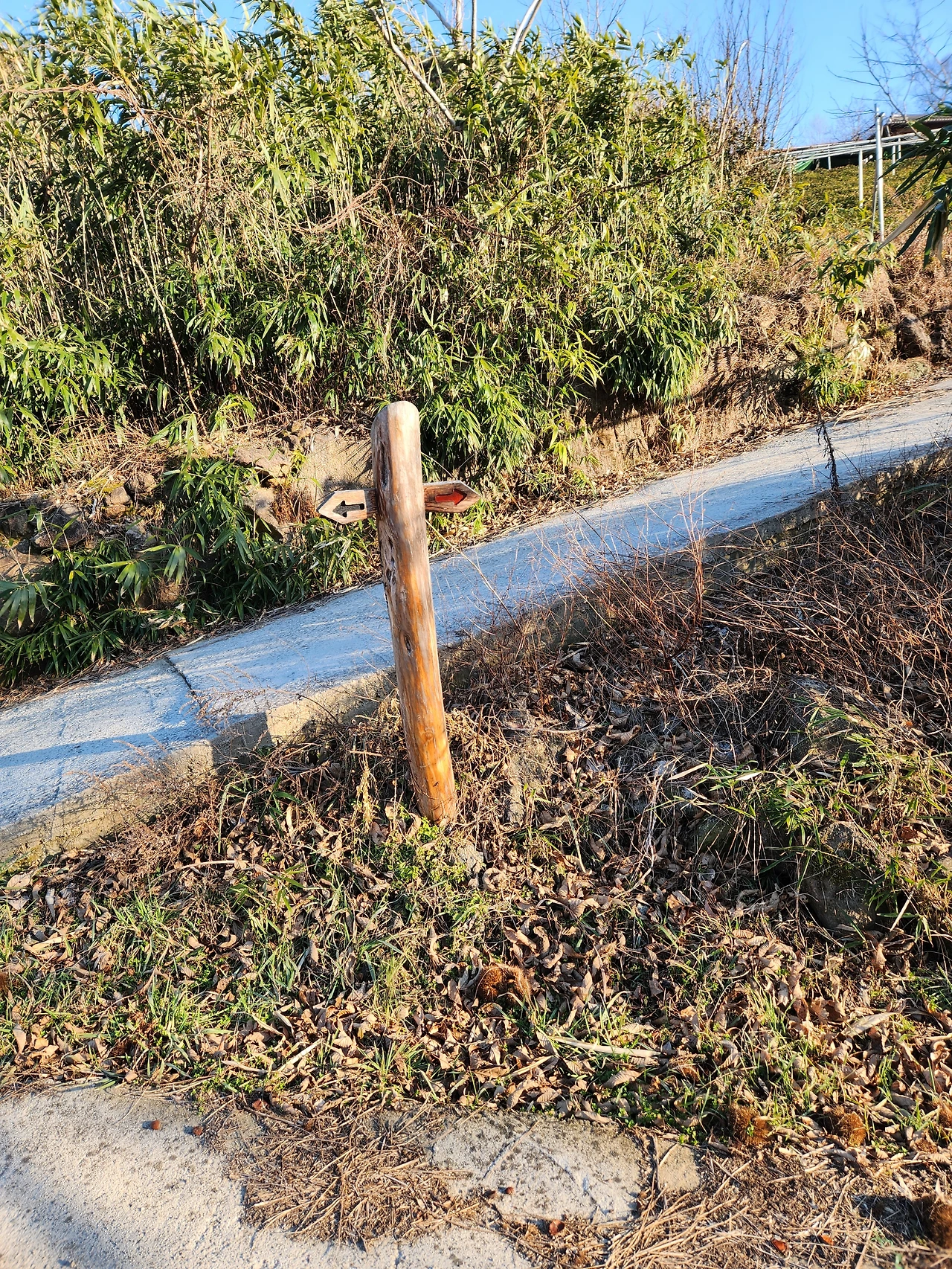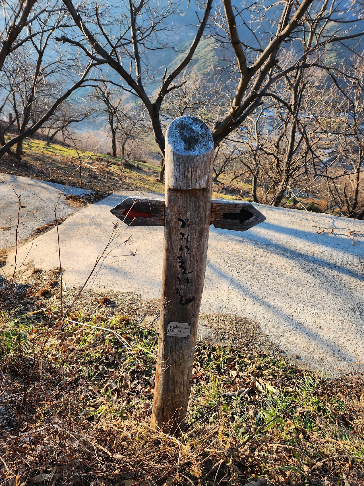 물이라도 한 잔 마시고 이야기해야지, 그냥은 입이 말라서 안 되겠다. 둘레길에서 돌아오고 이틀이나 지났는데 그 조그만 삼거리가 여전히 선명하다. 나와 아내는 길을 잘못 들어섰다. 변명이든 무엇이든 좋으니까 천천히 자세히 들여다보자. 그 덕분에 우리 네 사람이 고생한 것을 생각하면 지금도 어처구니가 없다. 가탄 3.3km 남았으니까 그대로 평지만 걸으면 한 시간이면 도착할 거리다. 우리가 제법 높은 지대에 있으니까 당연히 길이 서서히 내려가면서 나오는 동네, 거기쯤이 종착지가 될 거라고 여유를 부리고 있었다. 힘든 건 다 끝났다고, 여기서부터는 즐기자 싶었던 것이다. 그러니까 내 마음이 내리막길로 내려갈 채비를 막 마친 터에 삼거리가 나왔고 마침 또 화살표가 정말이지, 빨간색이 아랫길을 가리키는 거였다. 그래, 좋다, 좋아. 고생했다고 화살표도 예쁘게 이쪽을 가리키네. 아무 의심 없이 그 길로 걸어갔다. 한참을 가는데 애들이 휴대폰으로 물어온다. 길이 이상한데 그쪽이 맞냐고 묻는다. 두 번을 묻는데 맞으니까, 그대로 오라며 재촉했다. 그런데 다시 작은 삼거리가 나왔고 거기에는 이정표가 없었다. 가던 대로니까 이정표를 따로 두지 않았겠지, 그렇게 걸었는데 막다른 곳이었다. 그렇다면 아랫길이었네, 다시 돌아 나와 넷이서 아래로 걸었다. 곧 길이 다 끝나겠구나, 고로쇠 물을 채취하는 농장 같은 곳이었다. 길이 없는데도 거기가 길이라고만 여겼다. 지나는 사람들이 없으니까 그러면서 풀을 헤치다가, 이런 적이 없었다는 사실에 번쩍 정신이 들었다. 아까, 거기! 우리가 위로 올라가지 않고 내려왔던 데, 거기 화살표를 잘못 본 거 같은데! 정말 그랬다. 내려갔던 길을 꾸역꾸역 다시 올라와서 여덟 개의 눈이 화살표의 방향을 확인했다. 우리가, 아니 내가 잘못 봤다. 마음이 시키는 대로 눈이 본 것이다. 나는 이정표 뒷면을 보면서도 전혀 의심하지 않았던 것이다. 보기 좋게 당했다. 앞에서 제대로 본 이정표에는 원부춘 10.0km, 가탄 3.3km. 그리고 이쪽! 헷갈릴 것 전혀 없는 안내목이었다.
