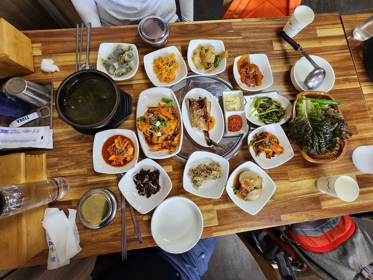 용호정을 지나서 구례 군민 체육시설 앞에 도착했다. 그늘 없이 걸어왔다. 날이 좋았다면 더 힘들었을 것이다. 흐려서 좋은 날이다. 글쎄, 밥을 뭐 먹으러 갈까. 점심 먹을 시간에 정확히 맞춘 듯하다. 주변에 건물들이 보이고 공원에 나와 휴일을 즐기는 사람들이 보였다. 맨날 국밥만 사는 것 같아서 먼저 말을 꺼냈다. 저기 숯불갈비 있네, 얘들도 없으니까 맛있는 거 먹자고 꼬셨다. 낮에 고기 먹는 것이 별로였는지 아니면 비싼 물가 때문에 선뜻 내키지 않았는지 아내는 다른 것 먹자고 그런다. (생각해 보면 그래도 한 번 더 권했어야 했다. 부부는 그러냐고 쉽게 수긍하고 얼른 다른 데를 찾는다. 만만한 거, 국밥 같은 거 말이다.) 건너편에 딱 좋은 간판이 보였다. 지리산 밥상. 지리산 밥집 그랬으면 주저했을지도 모른다. '밥상' 그러니까 솔깃해지고 결정이 쉬웠다. 저기!