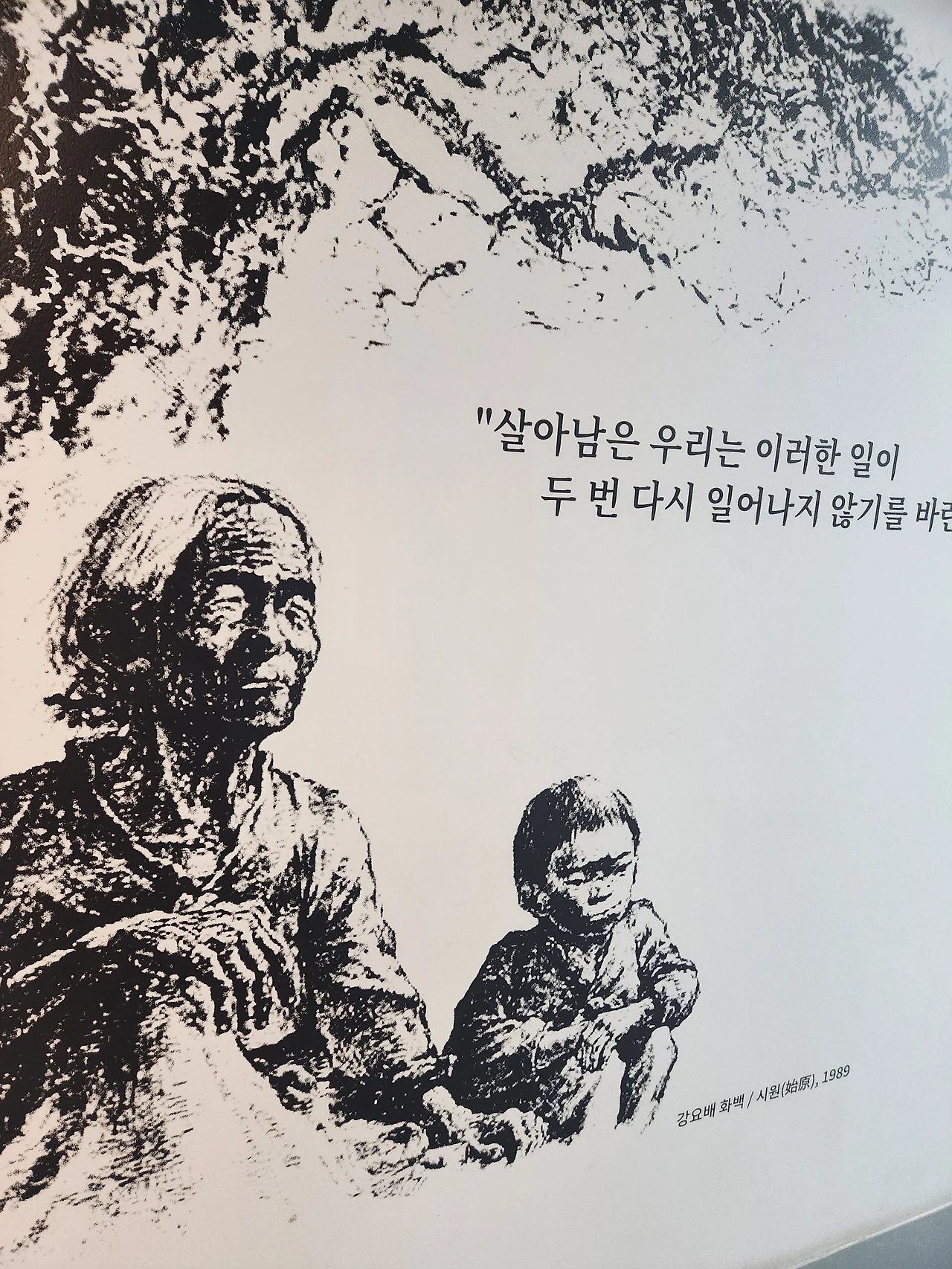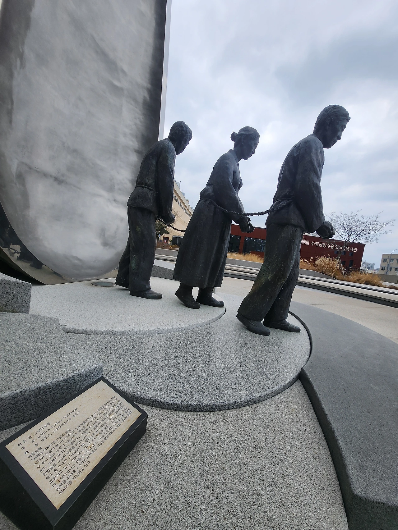 - 일제 강점기 동양척식주식회사 제주 주정공장인 이곳은 제주 4·3사건 당시 최대 규모의 강제수용소로 이용되었다. 군경의 무차별 학살극을 피해 한라산 등지로 피난했던 주민들이 산에서 내려오자 이곳에 수용되었다. 수용자들은 혹독한 고문과 열약한 환경 때문에 죽기도 했다. 일부는 석방되었지만 대다수는 총살 당해 암매장 됐거나 바다에 던져져 희생되었다. - 안내 표지판을 읽고 숙연해졌다. 가까이 가서 본 조형물은 사람들이었다. 포승줄에 묶인 사람들이 거대한 눈물 한 방울 앞에서 끌려가는 모습이었다. 공포와 두려움으로 눈물조차 흘리지 못했던 날의 표정 '그날의 슬픔'이었다.