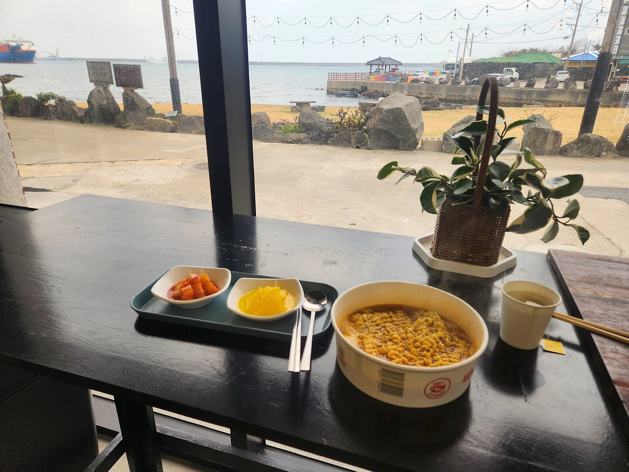 그쪽에 마땅한 밥집이 없었다. 삼각김밥도 두 개 다 먹고 출출하던 참이었다. 수석 구경을 한 곤을 커피에 들르고 싶었지만 커피보다는 배가 고팠다. 마침 그 옆에 라면이라고 써 붙인 가게가 있었다. 꼭 길을 가다가 돈을 주운 기분이었다. 가스불에 파 송송, 계란 넣고 끓여주는 라면인 줄 알았는데 물만 부으면 저절로 되는 요즘 스타일의 라면이었다. 처음 먹어보는 재미와 바다를 보면서 라면이라는 재미가 화음을 이뤘다. 3천 원짜리 라면을 먹는데 가게 안에 '눈의 꽃'이 흘렀다. 라면을 먹으려다 말고 카톡을 보냈다. 노란 단무지와 빨간 깍두기가 라면 옆에서 보기 좋다. 창가, 그리고 바다가 보이는 사진 아래에 적었다. '세상에 ··· 음악이 눈의 꽃이다.' 그 말이 광고 카피 같아서 마음에 든다. 18코스뿐만 아니라 올레를 전부 다 걸어도 저 느낌으로 통할 것만 같다. 올레를 걷다가 내가 만나고 싶은 것은 저와 같은 언밸런스다. 은근히 평화로워서 30분쯤 졸 수도 있다고 먼저 말하는 털털함을 나는 기다리고 있는지도 모른다. 방금 전에는 잃어버린 마을 곤을동, 지금은 눈의 꽃, 그 사이를 장식하는 잠연한 피곤. 라면 한 그릇을 다 먹지 못하고 남겼다. 내 감상과 내 몸은 이렇게 언밸런스다. 친절한 주인 내외가 알아차릴까 봐 얼른 화장실에 다녀왔다. 토하고 나면 금방 괜찮아진다. 가장 넘기기 어려운 것이 면발이라고 그러면 우습지 않나. 여전히 나는 국수며 라면 같은 면발을 우습게 본다. 그런 나를 그들도 우습게 보는 것 같다.