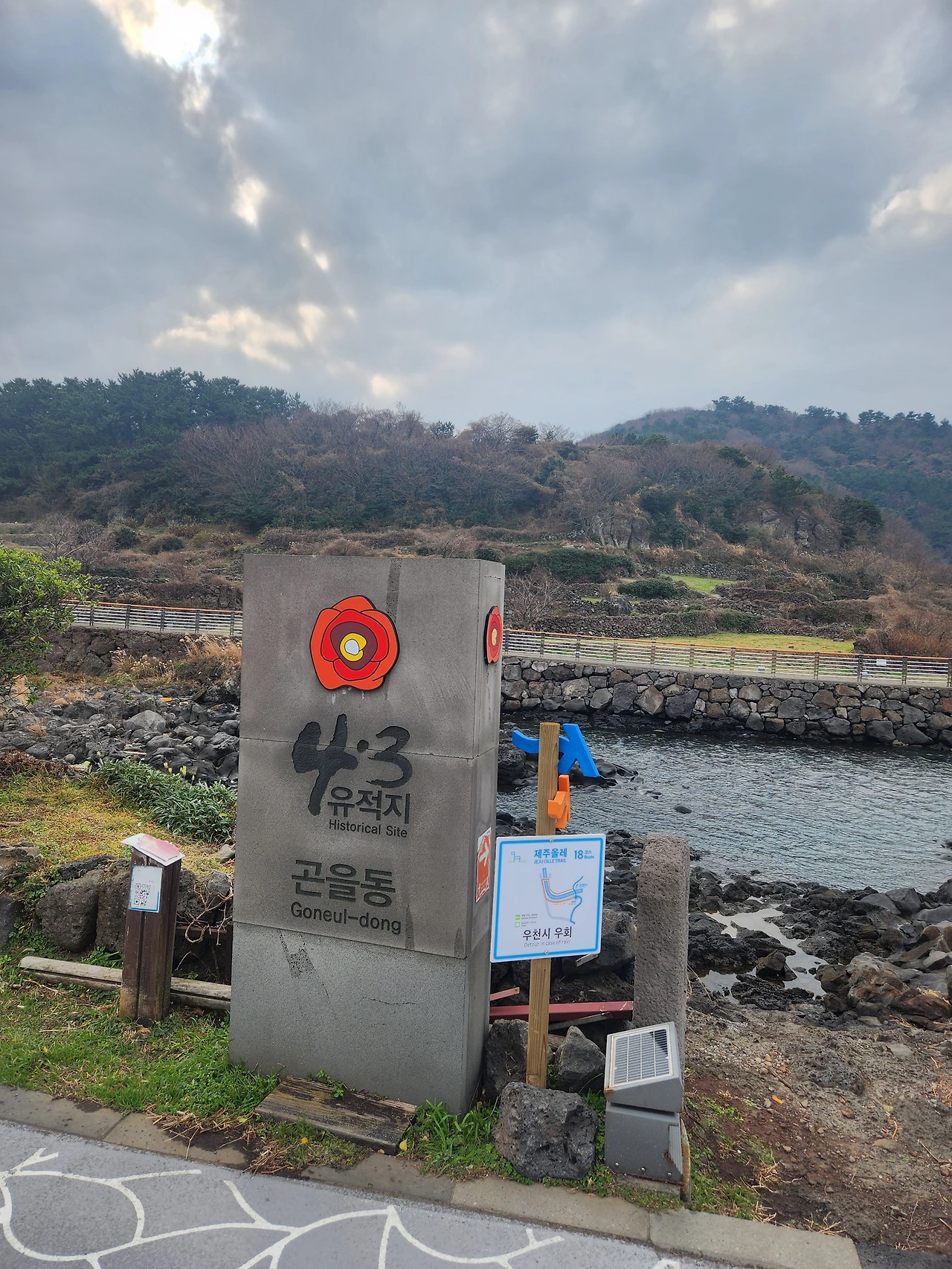 거기서 사람을 만난다. 자세히 보니 어두운 계통의 겨울 롱 코트였다. 롱 다운 패딩에 배낭을 양쪽으로 메고 사진기를 든 모습의 한국 사람인 줄 알았다. 작은 돌다리를 두고 서로 건너편에서 마주쳤다. 당연히 안녕하세요, 그러고 인사를 했다. 수줍어하며 흩날리는 머리카락을 한 손으로 정리하며 웃을 때까지도 눈치채지 못했다. 하이! 그녀에게서 나온 말은 뜻밖에도 하이였다. 내심 반가웠다. 올레길에 외국인, 게다가 너무 젊지도 않고 그렇다고 부담스럽지도 않은 나이의 건강한 영혼의 소유자들이 갖고 있는 미소를 보이는 여인. 뜻밖에도 손을 가로저어가며 영어는 모른다는 프랑스 사람이었다. 조심하는 듯했다. 그녀가 곤을동을 여기저기 포인트에서 사진을 찍는 것을 한동안 지켜보고 가려던 길을 갔다. 좋은 여행 되기를 바란다는 말을 건네고, Bye Bye.