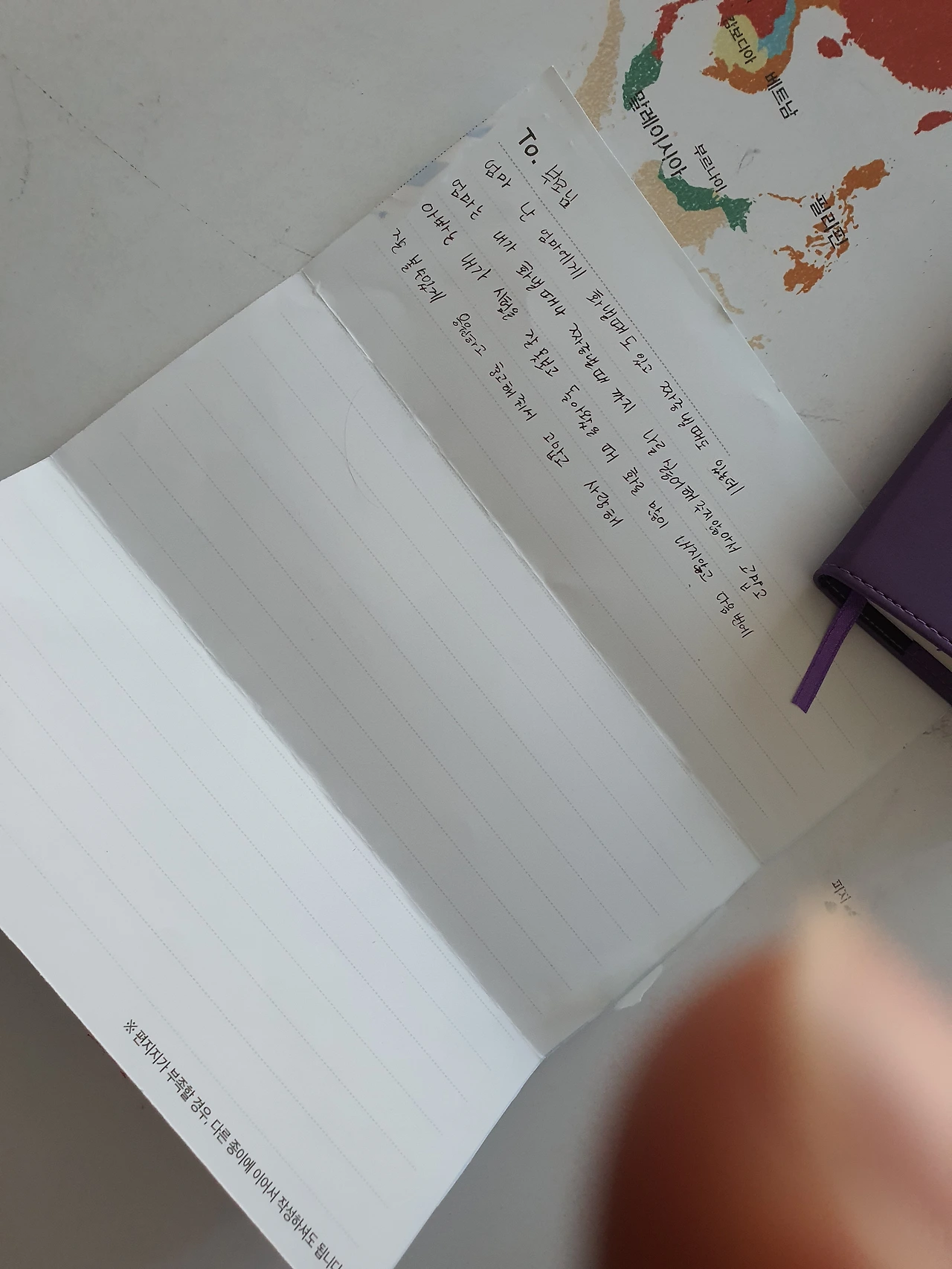 스물한 칸짜리 편지지 밑에는 편지지가 부족할 경우, 다른 종이에 이어서 작성하셔도 됩니다,라고 적혀있었다.