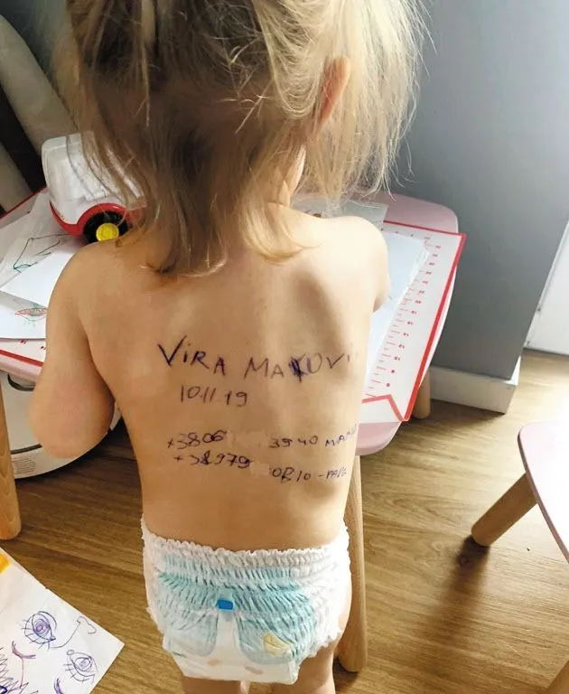 기저귀를 찬 어린 딸의 등에는 엄마가 적어 놓은 이름과 생년월일, 연락처 등이 쓰여있습니다.