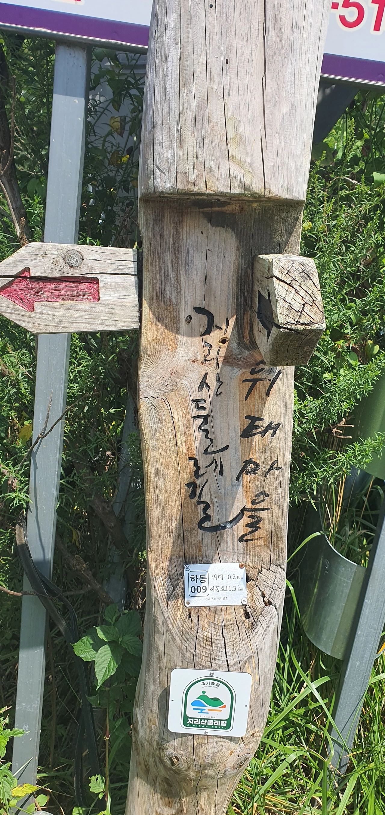 마을을 지키는 것은 감나무, 매미소리, 한참 푸른색이 짙어지는 벼, 그리고 예쁠 것도 없는 담장들이었다. 고즈넉하다는 말을 일러줬던 지난가을 날 산행, 형용사는 사람 그림자를 보고 쓰는 말이지. 마을 정류장 근처에 차를 세우고 짐을 챙기고 옷도 갈아입었다. 낮이었지만 적막했다. 낮이어서 적적했다. 한 사람도 못 봤다고 그러는 강이에게 웃음을 날렸다. 날이 덥잖아, 오늘 같은 날 둘레길 걷는 사람은 우리밖에 없을지도 몰라. 챙이 긴 모자는 산이와 내가 쓰고, 엄마와 강이는 목덜미부터 얼굴까지 가려주는 모자를 썼다. 이번 둘레길 10코스를 위해 특별히(?) 장만한 아이템이다. 최고는 몸빼라고 부르는 고무줄 통바지였다. 내가 몸빼가 몬페もんぺ인 것을 알고 놀랬던 교실, 선한 눈빛에 다리가 불편했던 고지마 선생님. 모두 옛날이야기가 됐다. 여름 산을 걸을 때는 몸빼만 한 것이 없더라고 나는 어디에 가서 외치고 싶다. 만약 몸빼를 입지 않았다면 얼마나 더 힘들었을까. 이제는 그 상상만으로도 아슬아슬하다. 몸빼 4인방, 출발!