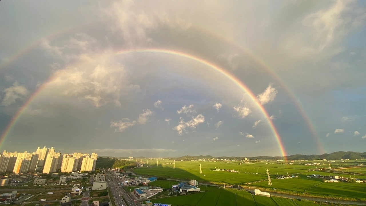 여름 하늘에 쌍무지개가 신비로웠던 어제였다. 나는 저것을 본 적 없는데 곧 밤이 들 텐데 사방이 연한 녹색으로 붐볐다. 딸아이가 애니메이션에 나오는 하늘 같다며 사진을 찍는다. 곳곳에서 무지개 봤냐며 물어온다. 자기들이 본 무지개를 보내준다. 이상하게 무지개가 사라지고 비가 내리기 시작했다. 비는 밤새 내렸다. 지금도 내리고 있다.