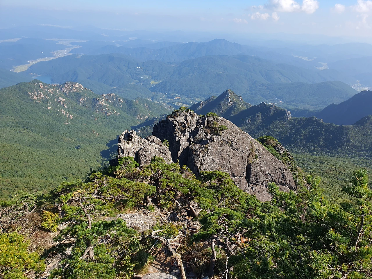 결국 서정재를 지나 칠불봉에 섰다. 오르고 또 오르면 못 오를 리 없다던 옛말이 바람에 날렸다. 바람은 늘 정상에 머물고 있는 것을 새삼 깨달았다. 미국 유타주에서 왔다던 젊은 친구가 구슬땀을 흘리며 다가왔다. 미소가 싱그러운 것이 좋은 인상이다. 오늘은 산에 사람이 없던데 이런 반가울 데가 있나. 산에 좀 다닌 눈치였다. 그가 먼저 내게 물었다. 너의 favorte는 뭐냐고? 월출산이라고 서슴없이 말해줬다. 눈이 커지면서 그가 외쳤다. 'We are on the same page.' 아, 내가 처음 듣는 표현이다. 그러나 아름다운 것을 바로 알았다. 그것 보고 '통했다'라고 그러는 거야, 혼잣말을 했다. 그는 내려가는 길이었고 나는 0.2km 떨어진 진짜 정상, 상왕봉에 가는 길이었다. 그는 내가 찍어준 사진을 오랫동안 볼 것이다. 저만치 가서 소리쳤다. I forgot to ask your name, 그가 소리쳤다. Tomy. 그가 또 소리쳤다. What's your name? Joshua. 오래전 내가 좋아했던 친구 이름을 대신 댔다. 그 친구는 지금쯤 무엇이 됐을까.