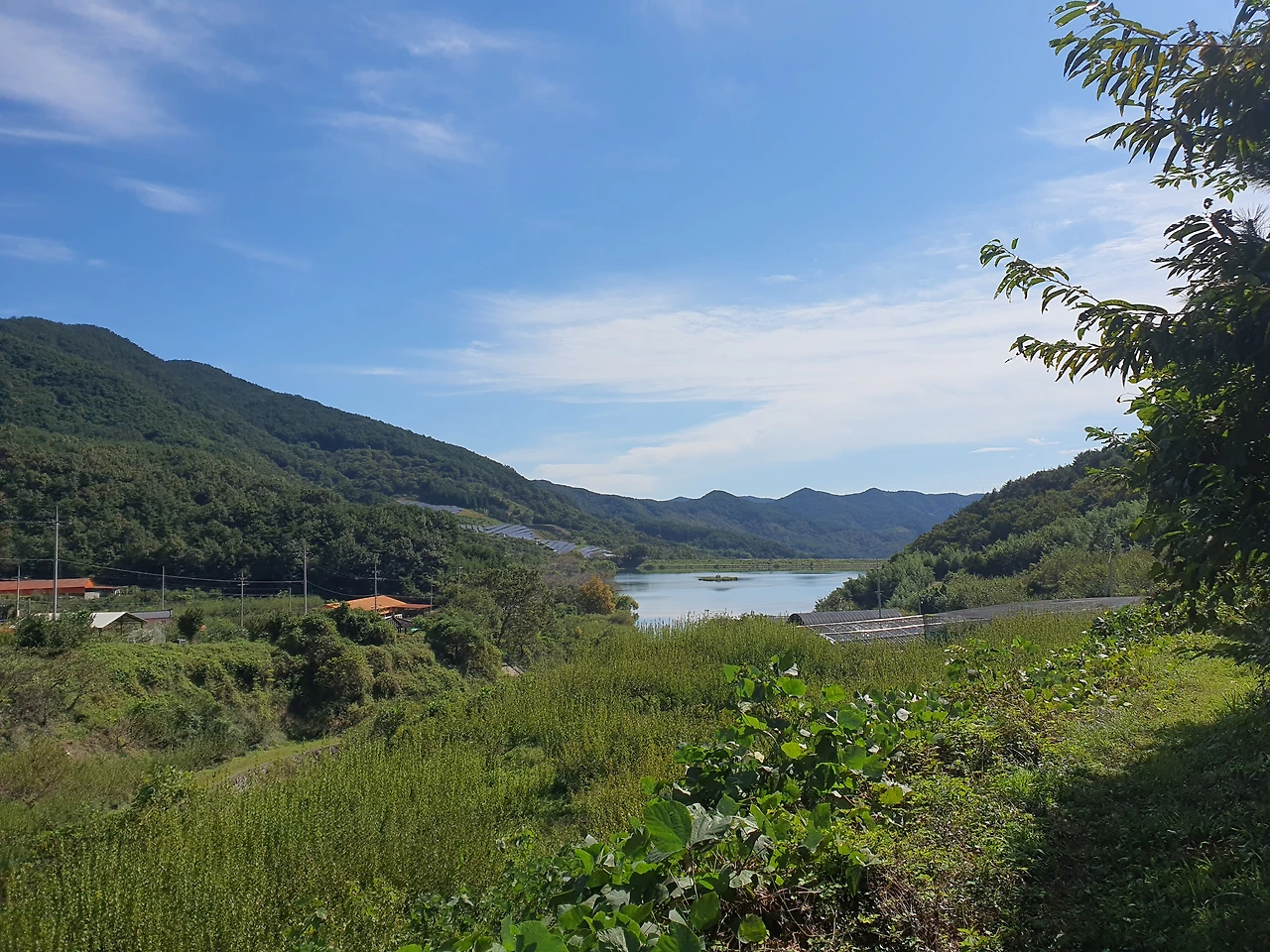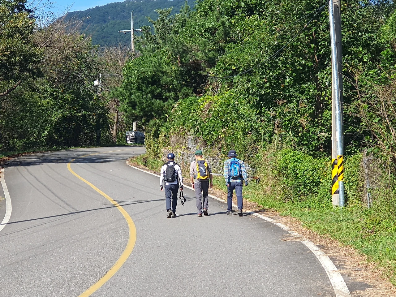 마디가 드러난 손가락이 저 위를 가리키며 주름진 입가에서 허물어진 소리가 새어 나왔다. 십자 모양의 표지가 보이지 않아 방금 올라갔다 내려온 골목을 다시 쫓아 올랐을 때, 옥상에 오르던 할머니가 내 차림을 읽고 묻기 전에 손으로 일러줬다. 저기로, 저쪽으로, 내가 용케 들었던 말은 저수지 아래로 가지 말고, 였다. 저쪽으로 그 한마디도 고마운데 '아래'가 아니란다. 나그네를 돕는 마음은 어느 시절의 나그네였을까. 할머니의 가장 눈부셨던 날은 어느 장면에서 지나갔을까. 우계 저수지도 파랗고 하늘도 파래서 사진을 찍었다. 저수지 옆길에는 내다 버린 쓰레기도 쌓였던데 한 뼘쯤 지나서 돌아다본 풍경에는 가을 한낮이 우두커니 앉아 있다. 사진 속 그가 어쩐지 정이 간다. 꼬부랑 밭이며 논이 눈에서 사라질 때까지 자꾸 돌아보았다. 서당 마을, 우계 저수지를 지나면 말 그대로 산골 마을이 나타난다. 산길에서 도로에 나와 높다란 커브를 돌면서 한참 오르면 정자가 하나 나온다. 강이야, 거기까지 오느라고 고생했다. 다들 강이에게 격려를 담은 시선을 보낸다. 엄마는 강이 옆에 껌딱지처럼 붙어서 다니고 있었다. 마을 회관 옆 담장에 그려진 벽화를 챙겨 볼 여유도 없었다. 아이들이 지치기 시작했다. 10km 남은 길에 고개가 두 개나 있었다. 그 고개 두 개가 그렇게 오래 올라야 하는 줄 알았더라면 계속 걸었을까. 하나씩 간식을 먹고 힘을 냈다. 마실 것은 충분히, 충분해야 한다. 아빠는 왜 걷자고 그럴까. 너희는 왜 묻지 않을까. 정자가 있어서 좋았다. 우리 좀 누웠다 가자. 얘들아,